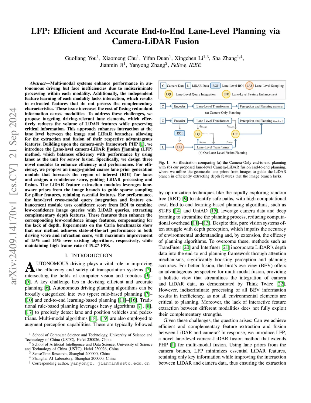 Multi-modal systems enhance performance in autonomous driving but face inefficiencies due to indiscriminate processing within each modality. Additionally, the independent feature learning of each modality lacks interaction, which results in extracted features that do not possess the complementary characteristics. These issue increases the cost of fusing redundant information across modalities. To address these challenges, we propose targeting driving-relevant elements, which reduces the volume of LiDAR features while preserving critical information. This approach enhances lane level interaction between the image and LiDAR branches, allowing for the extraction and fusion of their respective advantageous features. Building upon the camera-only framework PHP, we introduce the Lane-level camera-LiDAR Fusion Planning (LFP) method, which balances efficiency with performance by using lanes as the unit for sensor fusion. Specifically, we design three modules to enhance efficiency and performance. For efficiency, we propose an image-guided coarse lane prior generation module that forecasts the region of interest (ROI) for lanes and assigns a confidence score, guiding LiDAR processing. The LiDAR feature extraction modules leverages lane-aware priors from the image branch to guide sampling for pillar, retaining essential pillars. For performance, the lane-level cross-modal query integration and feature enhancement module uses confidence score from ROI to combine low-confidence image queries with LiDAR queries, extracting complementary depth features. These features enhance the low-confidence image features, compensating for the lack of depth. Experiments on the Carla benchmarks show that our method achieves state-of-the-art performance in both driving score and infraction score, with maximum improvement of 15% and 14% over existing algorithms, respectively, maintaining high frame rate of 19.27 FPS.