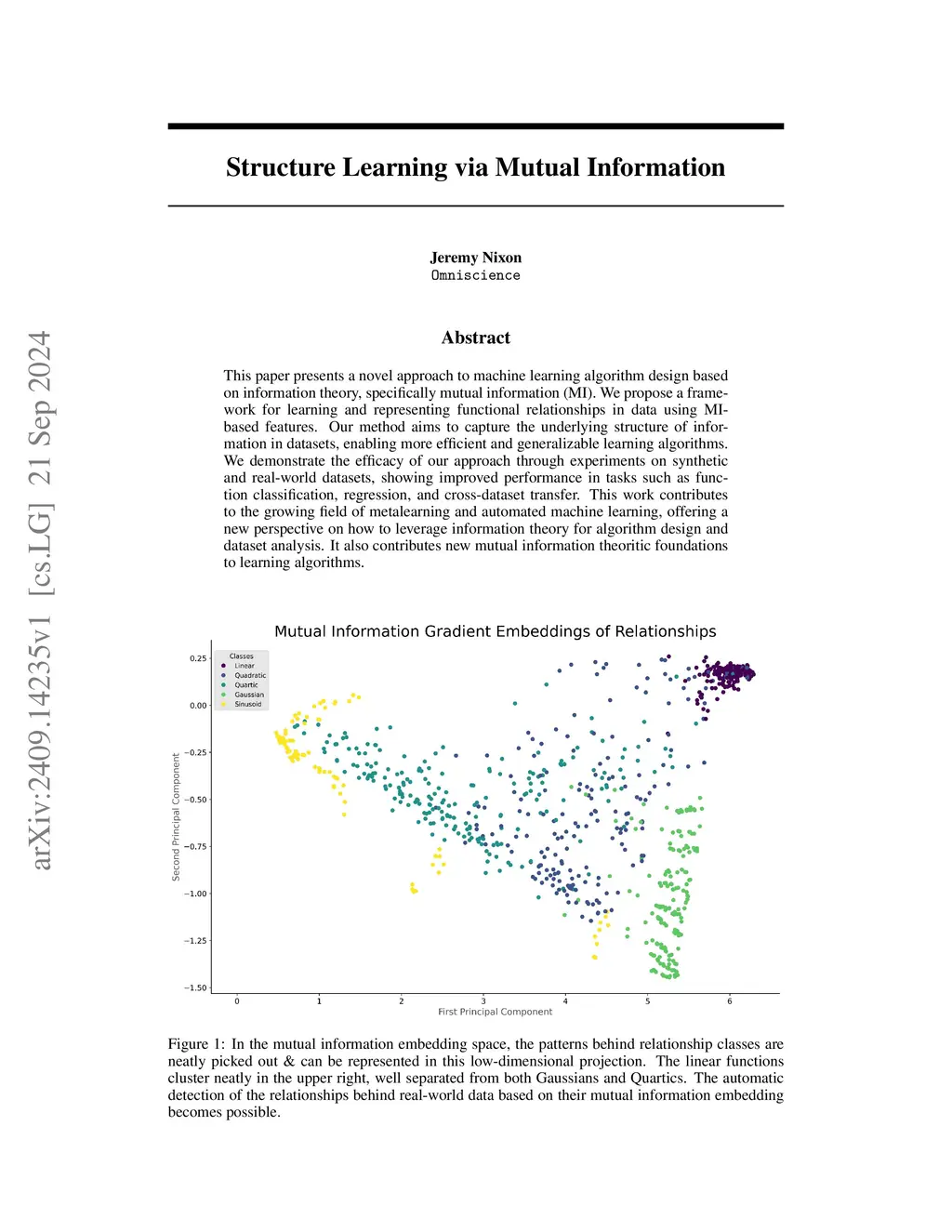 This paper presents a novel approach to machine learning algorithm design based on information theory, specifically mutual information (MI). We propose a framework for learning and representing functional relationships in data using MI-based features. Our method aims to capture the underlying structure of information in datasets, enabling more efficient and generalizable learning algorithms. We demonstrate the efficacy of our approach through experiments on synthetic and real-world datasets, showing improved performance in tasks such as function classification, regression, and cross-dataset transfer. This work contributes to the growing field of metalearning and automated machine learning, offering a new perspective on how to leverage information theory for algorithm design and dataset analysis and proposing new mutual information theoretic foundations to learning algorithms.