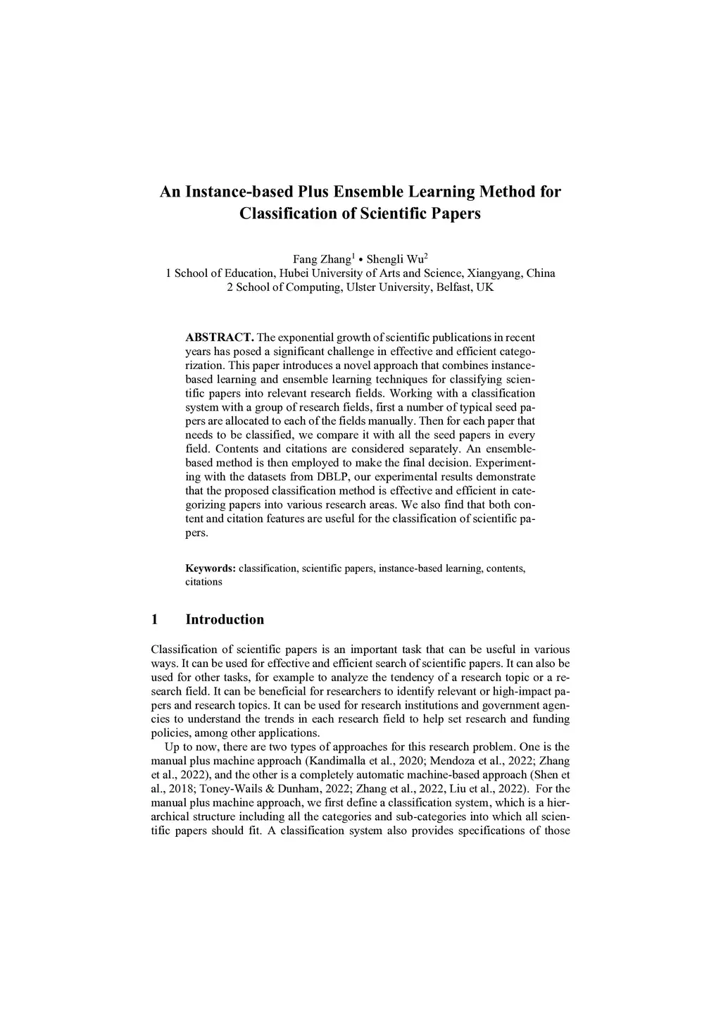 The exponential growth of scientific publications in recent years has posed a significant challenge in effective and efficient categorization. This paper introduces a novel approach that combines instance-based learning and ensemble learning techniques for classifying scientific papers into relevant research fields. Working with a classification system with a group of research fields, first a number of typical seed papers are allocated to each of the fields manually. Then for each paper that needs to be classified, we compare it with all the seed papers in every field. Contents and citations are considered separately. An ensemble-based method is then employed to make the final decision. Experimenting with the datasets from DBLP, our experimental results demonstrate that the proposed classification method is effective and efficient in categorizing papers into various research areas. We also find that both content and citation features are useful for the classification of scientific papers.