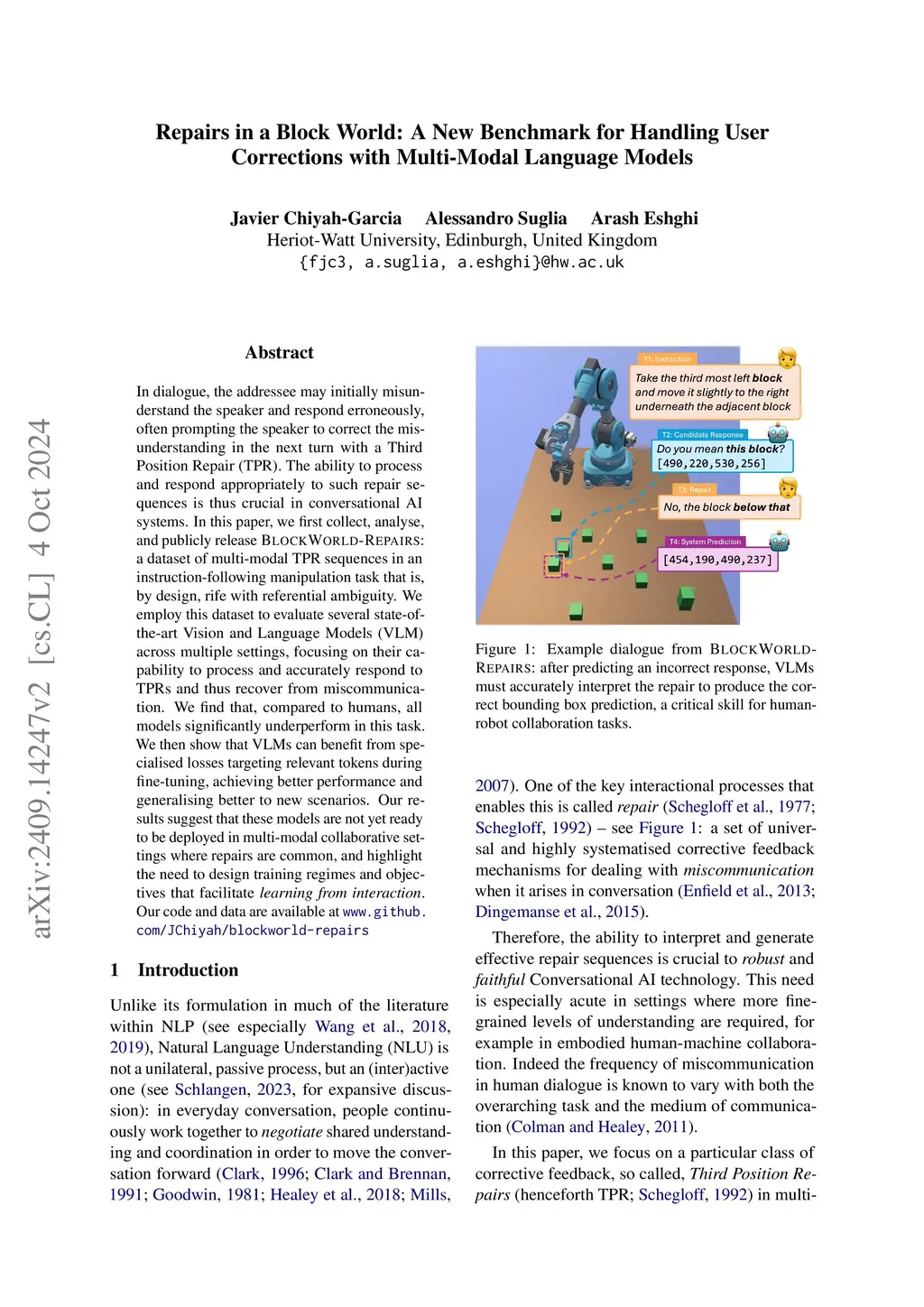 In dialogue, the addressee may initially misunderstand the speaker and respond erroneously, often prompting the speaker to correct the misunderstanding in the next turn with a Third Position Repair (TPR). The ability to process and respond appropriately to such repair sequences is thus crucial in conversational AI systems. In this paper, we first collect, analyse, and publicly release BlockWorld-Repairs: a dataset of multi-modal TPR sequences in an instruction-following manipulation task that is, by design, rife with referential ambiguity. We employ this dataset to evaluate several state-of-the-art Vision and Language Models (VLM) across multiple settings, focusing on their capability to process and accurately respond to TPRs and thus recover from miscommunication. We find that, compared to humans, all models significantly underperform in this task. We then show that VLMs can benefit from specialised losses targeting relevant tokens during fine-tuning, achieving better performance and generalising better to new scenarios. Our results suggest that these models are not yet ready to be deployed in multi-modal collaborative settings where repairs are common, and highlight the need to design training regimes and objectives that facilitate learning from interaction. Our code and data are available at www.github.com/JChiyah/blockworld-repairs