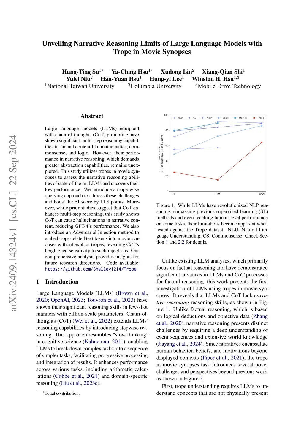 Large language models (LLMs) equipped with chain-of-thoughts (CoT) prompting have shown significant multi-step reasoning capabilities in factual content like mathematics, commonsense, and logic. However, their performance in narrative reasoning, which demands greater abstraction capabilities, remains unexplored. This study utilizes tropes in movie synopses to assess the abstract reasoning abilities of state-of-the-art LLMs and uncovers their low performance. We introduce a trope-wise querying approach to address these challenges and boost the F1 score by 11.8 points. Moreover, while prior studies suggest that CoT enhances multi-step reasoning, this study shows CoT can cause hallucinations in narrative content, reducing GPT-4's performance. We also introduce an Adversarial Injection method to embed trope-related text tokens into movie synopses without explicit tropes, revealing CoT's heightened sensitivity to such injections. Our comprehensive analysis provides insights for future research directions.