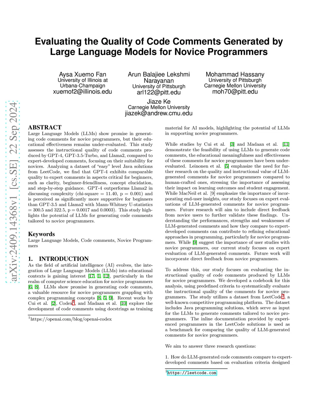 Large Language Models (LLMs) show promise in generating code comments for novice programmers, but their educational effectiveness remains under-evaluated. This study assesses the instructional quality of code comments produced by GPT-4, GPT-3.5-Turbo, and Llama2, compared to expert-developed comments, focusing on their suitability for novices. Analyzing a dataset of ``easy'' level Java solutions from LeetCode, we find that GPT-4 exhibits comparable quality to expert comments in aspects critical for beginners, such as clarity, beginner-friendliness, concept elucidation, and step-by-step guidance. GPT-4 outperforms Llama2 in discussing complexity (chi-square = 11.40, p = 0.001) and is perceived as significantly more supportive for beginners than GPT-3.5 and Llama2 with Mann-Whitney U-statistics = 300.5 and 322.5, p = 0.0017 and 0.0003). This study highlights the potential of LLMs for generating code comments tailored to novice programmers.