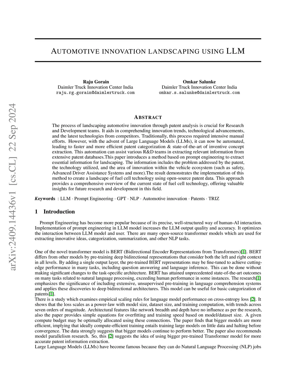 The process of landscaping automotive innovation through patent analysis is crucial for Research and Development teams. It aids in comprehending innovation trends, technological advancements, and the latest technologies from competitors. Traditionally, this process required intensive manual efforts. However, with the advent of Large Language Models (LLMs), it can now be automated, leading to faster and more efficient patent categorization & state-of-the-art of inventive concept extraction. This automation can assist various R\&D teams in extracting relevant information from extensive patent databases. This paper introduces a method based on prompt engineering to extract essential information for landscaping. The information includes the problem addressed by the patent, the technology utilized, and the area of innovation within the vehicle ecosystem (such as safety, Advanced Driver Assistance Systems and more).The result demonstrates the implementation of this method to create a landscape of fuel cell technology using open-source patent data. This approach provides a comprehensive overview of the current state of fuel cell technology, offering valuable insights for future research and development in this field.