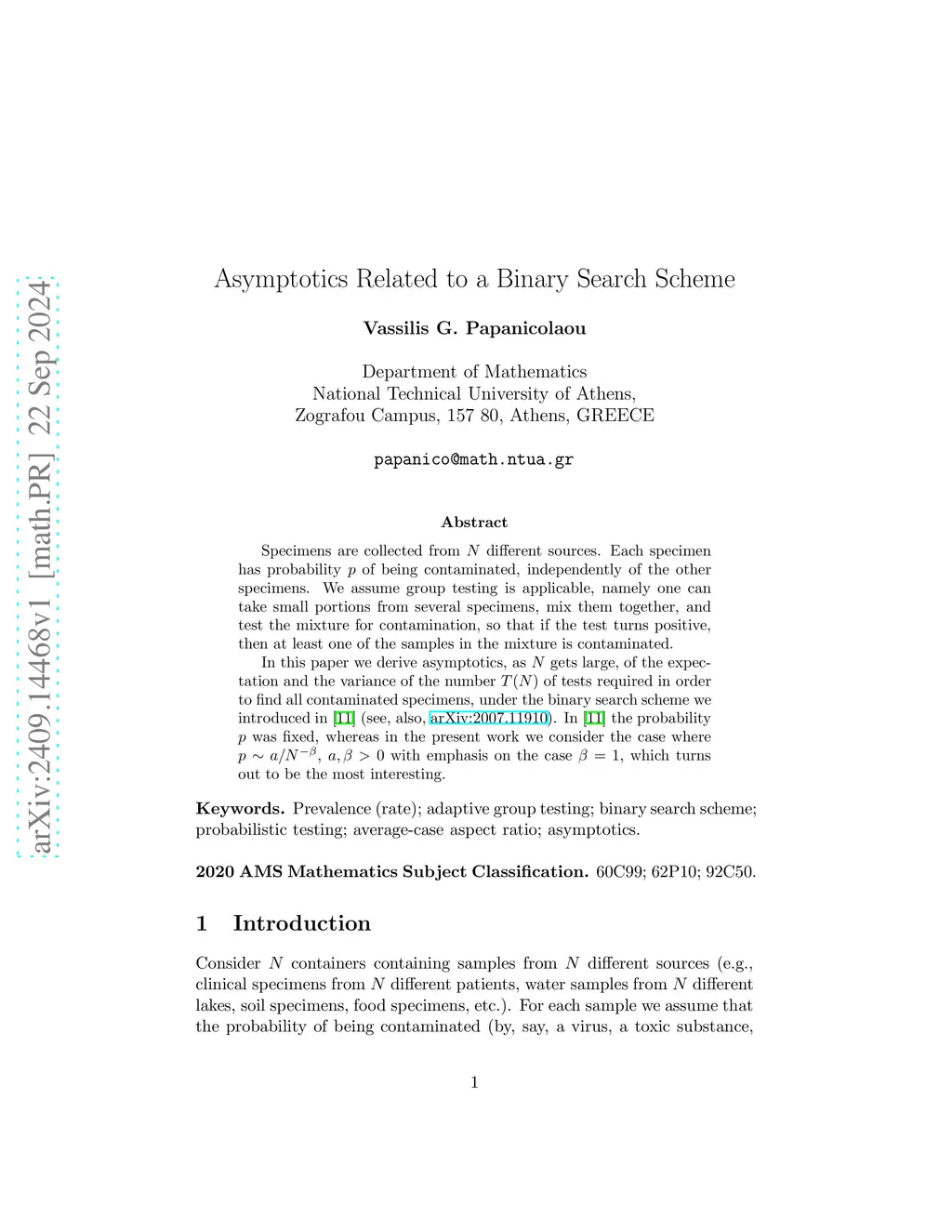 Specimens are collected from different sources. Each specimen has probability of being contaminated, independently of the other specimens. We assume group testing is applicable, namely one can take small portions from several specimens, mix them together, and test the mixture for contamination, so that if the test turns positive, then at least one of the samples in the mixture is contaminated. In this paper we derive asymptotics, as gets large, of the expectation and the variance of the number of tests required in order to find all contaminated specimens, under the binary search scheme we introduced in \cite{P} (see, also, arXiv:2007.11910). In \cite{P} the probability was fixed, whereas in the present work we consider the case where , with emphasis on the case , which turns out to be the most interesting.