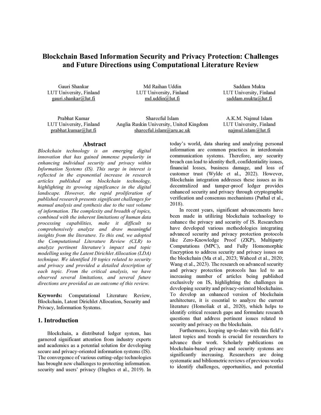 Blockchain technology is an emerging digital innovation that has gained immense popularity in enhancing individual security and privacy within Information Systems (IS). This surge in interest is reflected in the exponential increase in research articles published on blockchain technology, highlighting its growing significance in the digital landscape. However, the rapid proliferation of published research presents significant challenges for manual analysis and synthesis due to the vast volume of information. The complexity and breadth of topics, combined with the inherent limitations of human data processing capabilities, make it difficult to comprehensively analyze and draw meaningful insights from the literature. To this end, we adopted the Computational Literature Review (CLR) to analyze pertinent literature impact and topic modelling using the Latent Dirichlet Allocation (LDA) technique. We identified 10 topics related to security and privacy and provided a detailed description of each topic. From the critical analysis, we have observed several limitations, and several future directions are provided as an outcome of this review.