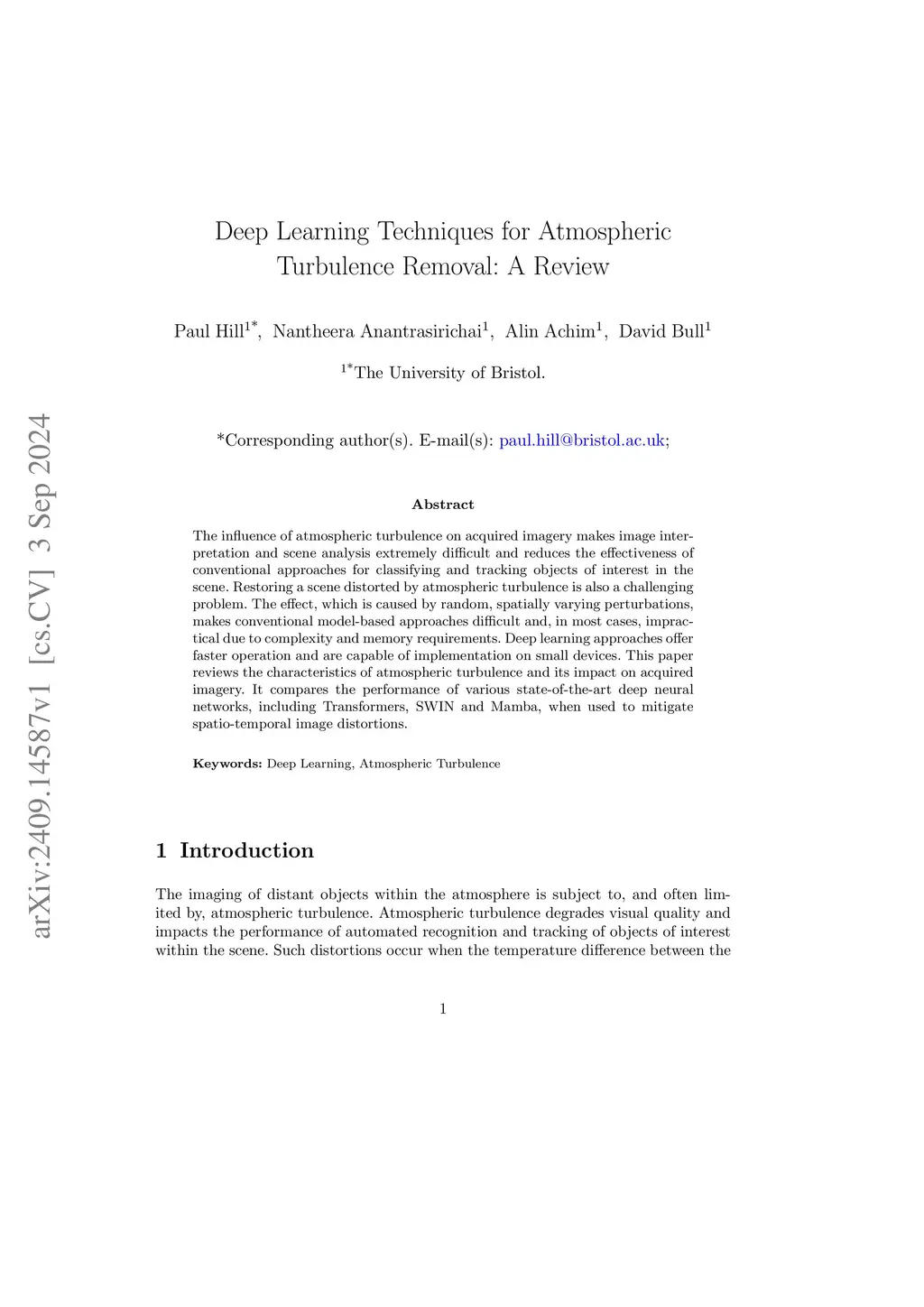 The influence of atmospheric turbulence on acquired imagery makes image interpretation and scene analysis extremely difficult and reduces the effectiveness of conventional approaches for classifying and tracking objects of interest in the scene. Restoring a scene distorted by atmospheric turbulence is also a challenging problem. The effect, which is caused by random, spatially varying perturbations, makes conventional model-based approaches difficult and, in most cases, impractical due to complexity and memory requirements. Deep learning approaches offer faster operation and are capable of implementation on small devices. This paper reviews the characteristics of atmospheric turbulence and its impact on acquired imagery. It compares the performance of various state-of-the-art deep neural networks, including Transformers, SWIN and Mamba, when used to mitigate spatio-temporal image distortions.