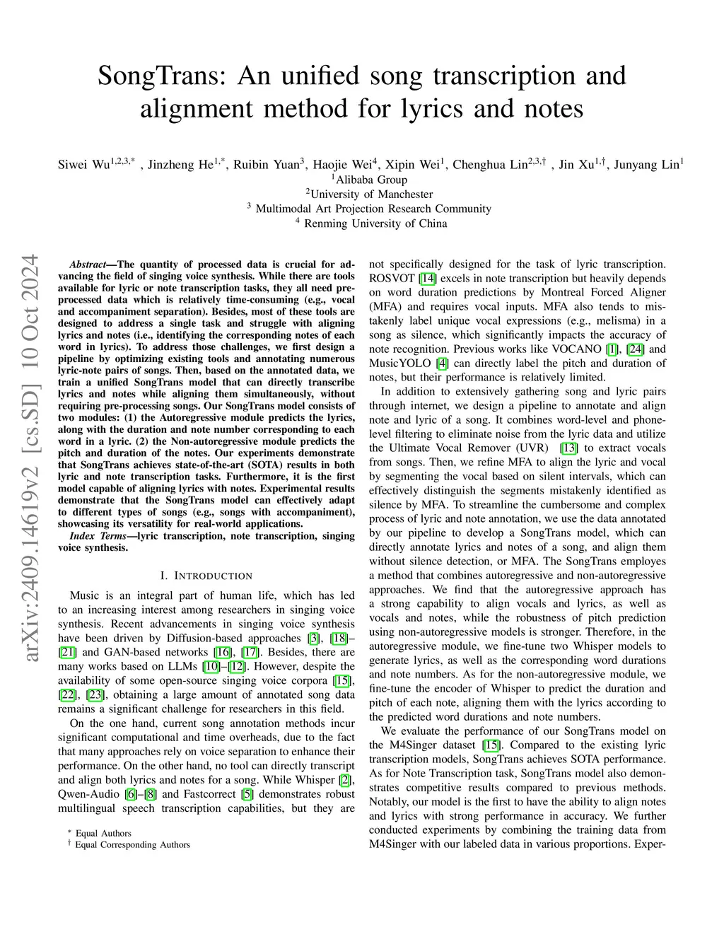 The quantity of processed data is crucial for advancing the field of singing voice synthesis. While there are tools available for lyric or note transcription tasks, they all need pre-processed data which is relatively time-consuming (e.g., vocal and accompaniment separation). Besides, most of these tools are designed to address a single task and struggle with aligning lyrics and notes (i.e., identifying the corresponding notes of each word in lyrics). To address those challenges, we first design a pipeline by optimizing existing tools and annotating numerous lyric-note pairs of songs. Then, based on the annotated data, we train a unified SongTrans model that can directly transcribe lyrics and notes while aligning them simultaneously, without requiring pre-processing songs. Our SongTrans model consists of two modules: (1) the \textbf{Autoregressive module} predicts the lyrics, along with the duration and note number corresponding to each word in a lyric. (2) the \textbf{Non-autoregressive module} predicts the pitch and duration of the notes. Our experiments demonstrate that SongTrans achieves state-of-the-art (SOTA) results in both lyric and note transcription tasks. Furthermore, it is the first model capable of aligning lyrics with notes. Experimental results demonstrate that the SongTrans model can effectively adapt to different types of songs (e.g., songs with accompaniment), showcasing its versatility for real-world applications.