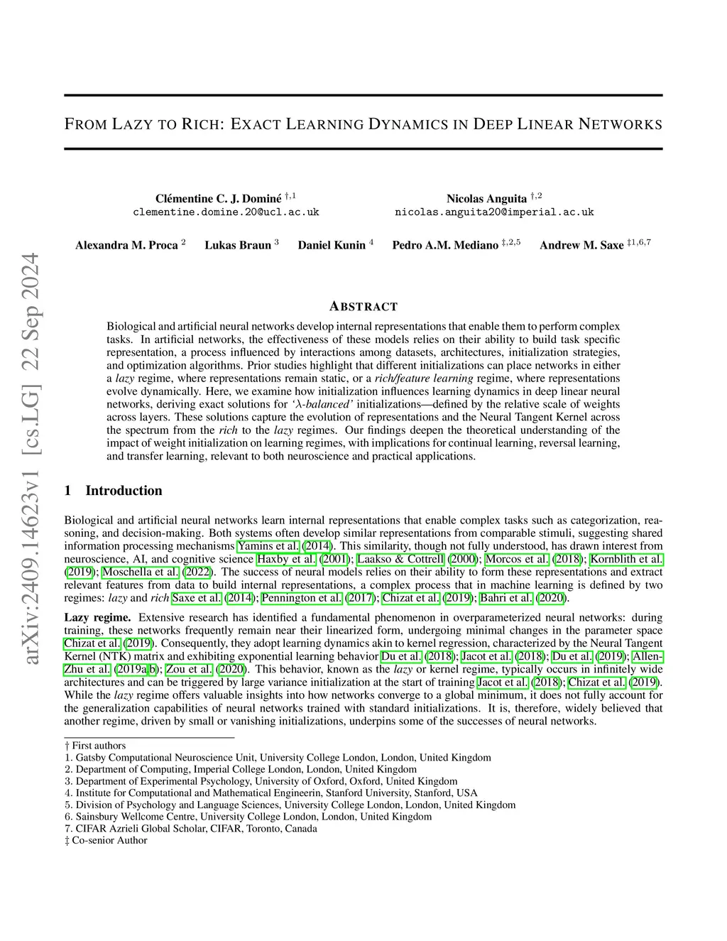 Biological and artificial neural networks develop internal representations that enable them to perform complex tasks. In artificial networks, the effectiveness of these models relies on their ability to build task specific representation, a process influenced by interactions among datasets, architectures, initialization strategies, and optimization algorithms. Prior studies highlight that different initializations can place networks in either a lazy regime, where representations remain static, or a rich/feature learning regime, where representations evolve dynamically. Here, we examine how initialization influences learning dynamics in deep linear neural networks, deriving exact solutions for lambda-balanced initializations-defined by the relative scale of weights across layers. These solutions capture the evolution of representations and the Neural Tangent Kernel across the spectrum from the rich to the lazy regimes. Our findings deepen the theoretical understanding of the impact of weight initialization on learning regimes, with implications for continual learning, reversal learning, and transfer learning, relevant to both neuroscience and practical applications.