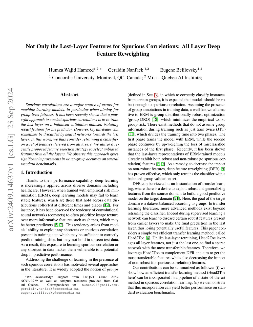 Spurious correlations are a major source of errors for machine learning models, in particular when aiming for group-level fairness. It has been recently shown that a powerful approach to combat spurious correlations is to re-train the last layer on a balanced validation dataset, isolating robust features for the predictor. However, key attributes can sometimes be discarded by neural networks towards the last layer. In this work, we thus consider retraining a classifier on a set of features derived from all layers. We utilize a recently proposed feature selection strategy to select unbiased features from all the layers. We observe this approach gives significant improvements in worst-group accuracy on several standard benchmarks.