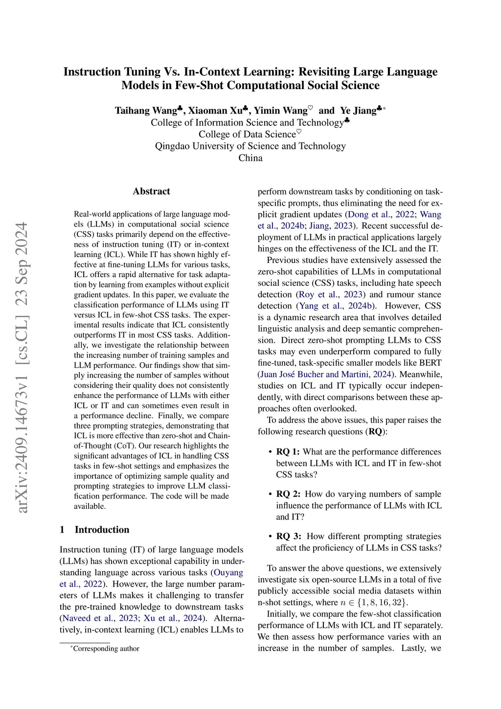 Real-world applications of large language models (LLMs) in computational social science (CSS) tasks primarily depend on the effectiveness of instruction tuning (IT) or in-context learning (ICL). While IT has shown highly effective at fine-tuning LLMs for various tasks, ICL offers a rapid alternative for task adaptation by learning from examples without explicit gradient updates. In this paper, we evaluate the classification performance of LLMs using IT versus ICL in few-shot CSS tasks. The experimental results indicate that ICL consistently outperforms IT in most CSS tasks. Additionally, we investigate the relationship between the increasing number of training samples and LLM performance. Our findings show that simply increasing the number of samples without considering their quality does not consistently enhance the performance of LLMs with either ICL or IT and can sometimes even result in a performance decline. Finally, we compare three prompting strategies, demonstrating that ICL is more effective than zero-shot and Chain-of-Thought (CoT). Our research highlights the significant advantages of ICL in handling CSS tasks in few-shot settings and emphasizes the importance of optimizing sample quality and prompting strategies to improve LLM classification performance. The code will be made available.