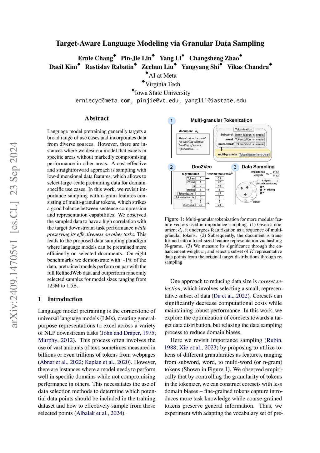 Language model pretraining generally targets a broad range of use cases and incorporates data from diverse sources. However, there are instances where we desire a model that excels in specific areas without markedly compromising performance in other areas. A cost-effective and straightforward approach is sampling with low-dimensional data features, which allows to select large-scale pretraining data for domain-specific use cases. In this work, we revisit importance sampling with n-gram features consisting of multi-granular tokens, which strikes a good balance between sentence compression and representation capabilities. We observed the sampled data to have a high correlation with the target downstream task performance while preserving its effectiveness on other tasks. This leads to the proposed data sampling paradigm where language models can be pretrained more efficiently on selected documents. On eight benchmarks we demonstrate with 1% of the data, pretrained models perform on par with the full RefinedWeb data and outperform randomly selected samples for model sizes ranging from 125M to 1.5B.
