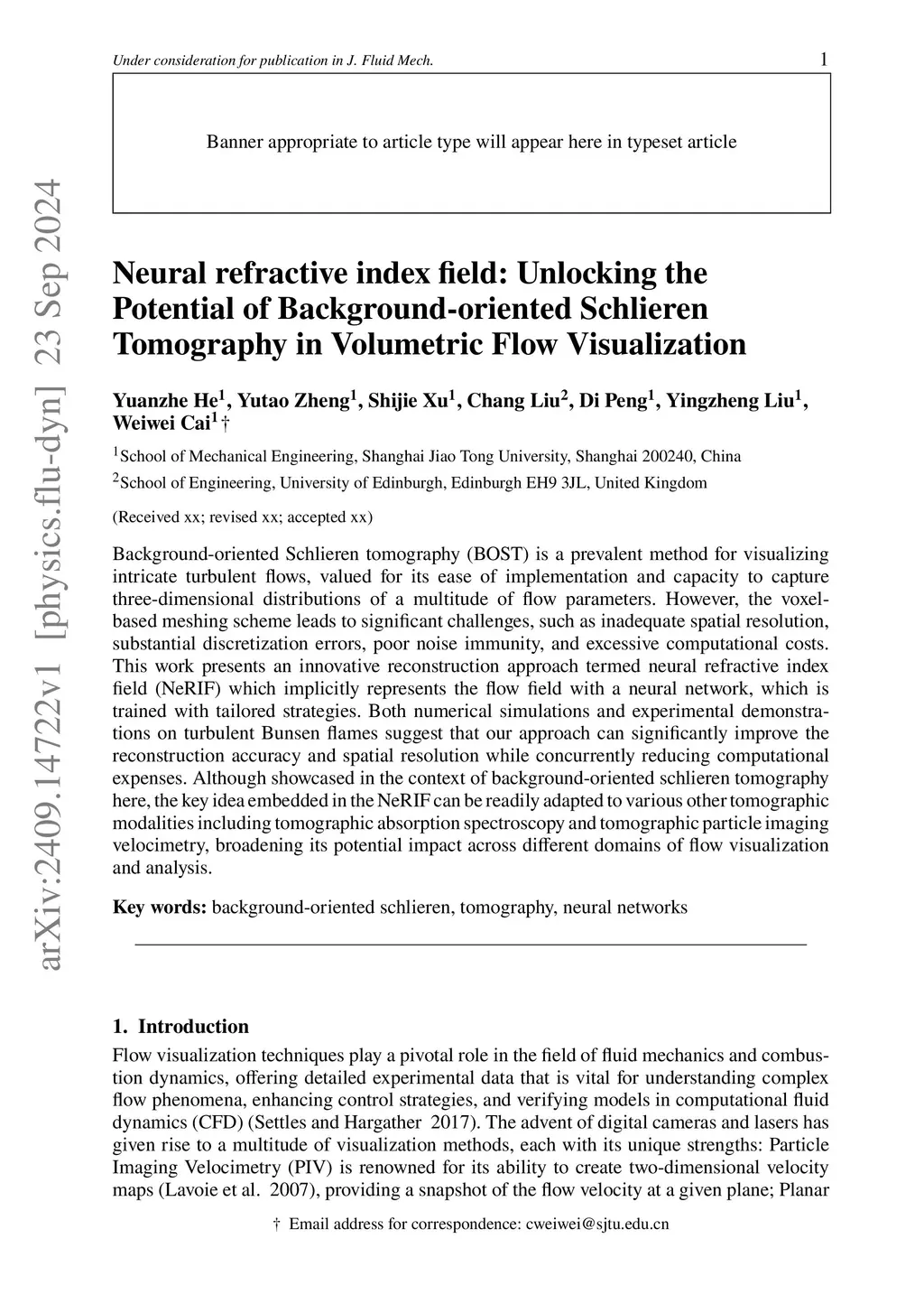Background-oriented Schlieren tomography (BOST) is a prevalent method for visualizing intricate turbulent flows, valued for its ease of implementation and capacity to capture three-dimensional distributions of a multitude of flow parameters. However, the voxel-based meshing scheme leads to significant challenges, such as inadequate spatial resolution, substantial discretization errors, poor noise immunity, and excessive computational costs. This work presents an innovative reconstruction approach termed neural refractive index field (NeRIF) which implicitly represents the flow field with a neural network, which is trained with tailored strategies. Both numerical simulations and experimental demonstrations on turbulent Bunsen flames suggest that our approach can significantly improve the reconstruction accuracy and spatial resolution while concurrently reducing computational expenses. Although showcased in the context of background-oriented schlieren tomography here, the key idea embedded in the NeRIF can be readily adapted to various other tomographic modalities including tomographic absorption spectroscopy and tomographic particle imaging velocimetry, broadening its potential impact across different domains of flow visualization and analysis.