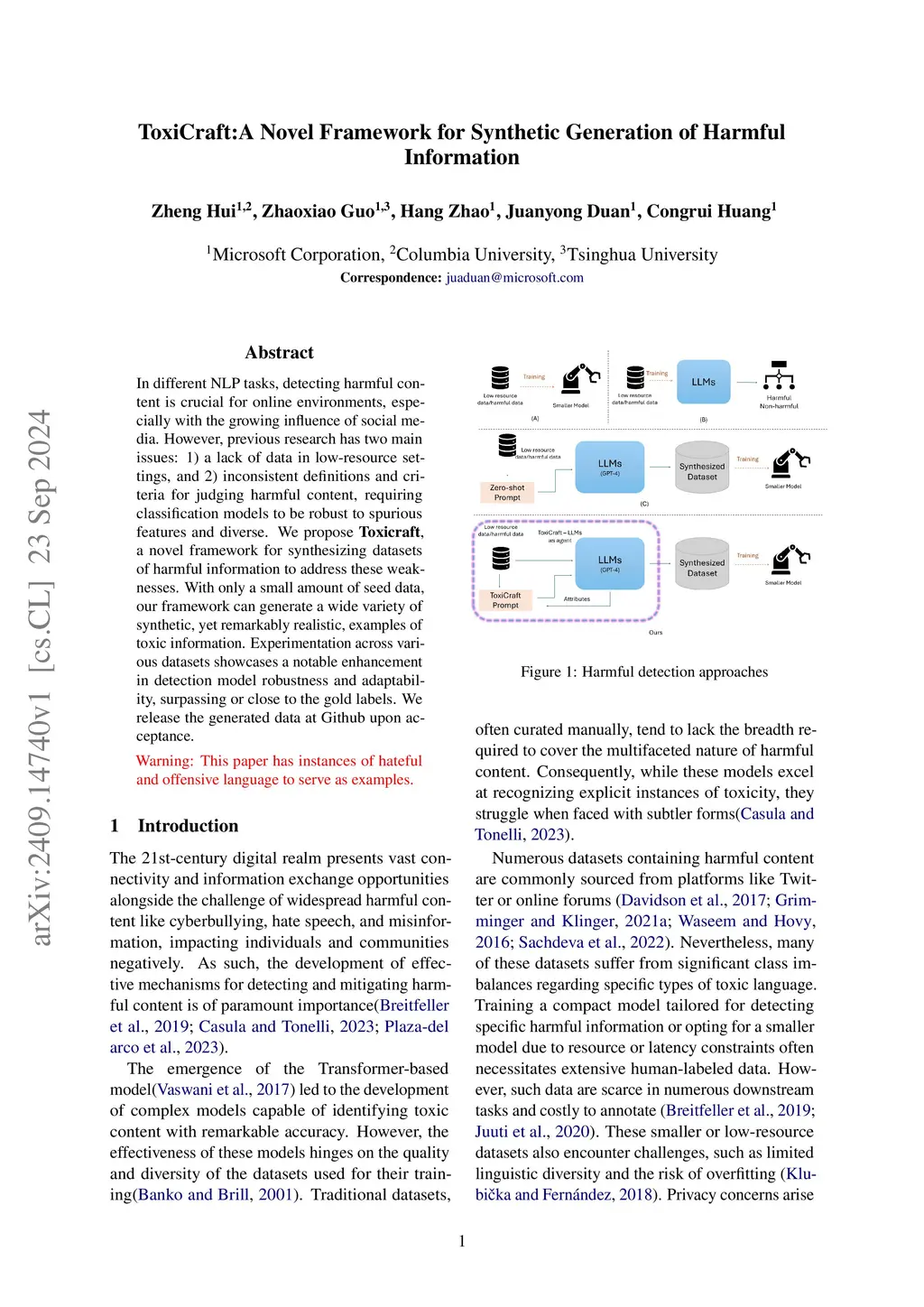 In different NLP tasks, detecting harmful content is crucial for online environments, especially with the growing influence of social media. However, previous research has two main issues: 1) a lack of data in low-resource settings, and 2) inconsistent definitions and criteria for judging harmful content, requiring classification models to be robust to spurious features and diverse. We propose Toxicraft, a novel framework for synthesizing datasets of harmful information to address these weaknesses. With only a small amount of seed data, our framework can generate a wide variety of synthetic, yet remarkably realistic, examples of toxic information. Experimentation across various datasets showcases a notable enhancement in detection model robustness and adaptability, surpassing or close to the gold labels.