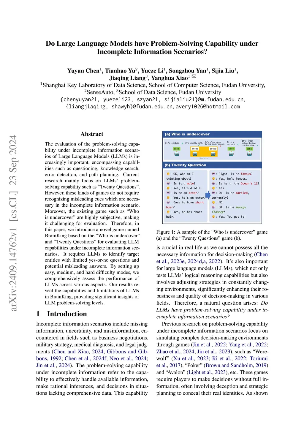 The evaluation of the problem-solving capability under incomplete information scenarios of Large Language Models (LLMs) is increasingly important, encompassing capabilities such as questioning, knowledge search, error detection, and path planning. Current research mainly focus on LLMs' problem-solving capability such as ``Twenty Questions''. However, these kinds of games do not require recognizing misleading cues which are necessary in the incomplete information scenario. Moreover, the existing game such as ``Who is undercover'' are highly subjective, making it challenging for evaluation. Therefore, in this paper, we introduce a novel game named BrainKing based on the ``Who is undercover'' and ``Twenty Questions'' for evaluating LLM capabilities under incomplete information scenarios. It requires LLMs to identify target entities with limited yes-or-no questions and potential misleading answers. By setting up easy, medium, and hard difficulty modes, we comprehensively assess the performance of LLMs across various aspects. Our results reveal the capabilities and limitations of LLMs in BrainKing, providing significant insights of LLM problem-solving levels.