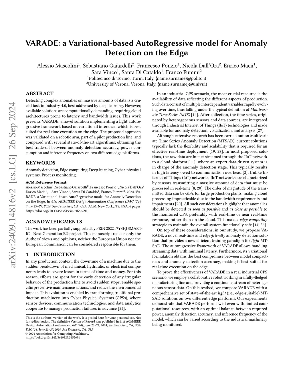 Detecting complex anomalies on massive amounts of data is a crucial task in Industry 4.0, best addressed by deep learning. However, available solutions are computationally demanding, requiring cloud architectures prone to latency and bandwidth issues. This work presents VARADE, a novel solution implementing a light autoregressive framework based on variational inference, which is best suited for real-time execution on the edge. The proposed approach was validated on a robotic arm, part of a pilot production line, and compared with several state-of-the-art algorithms, obtaining the best trade-off between anomaly detection accuracy, power consumption and inference frequency on two different edge platforms.