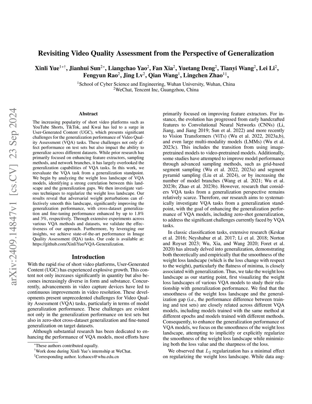 The increasing popularity of short video platforms such as YouTube Shorts, TikTok, and Kwai has led to a surge in User-Generated Content (UGC), which presents significant challenges for the generalization performance of Video Quality Assessment (VQA) tasks. These challenges not only affect performance on test sets but also impact the ability to generalize across different datasets. While prior research has primarily focused on enhancing feature extractors, sampling methods, and network branches, it has largely overlooked the generalization capabilities of VQA tasks. In this work, we reevaluate the VQA task from a generalization standpoint. We begin by analyzing the weight loss landscape of VQA models, identifying a strong correlation between this landscape and the generalization gaps. We then investigate various techniques to regularize the weight loss landscape. Our results reveal that adversarial weight perturbations can effectively smooth this landscape, significantly improving the generalization performance, with cross-dataset generalization and fine-tuning performance enhanced by up to 1.8% and 3%, respectively. Through extensive experiments across various VQA methods and datasets, we validate the effectiveness of our approach. Furthermore, by leveraging our insights, we achieve state-of-the-art performance in Image Quality Assessment (IQA) tasks. Our code is available at https://github.com/XinliYue/VQA-Generalization.