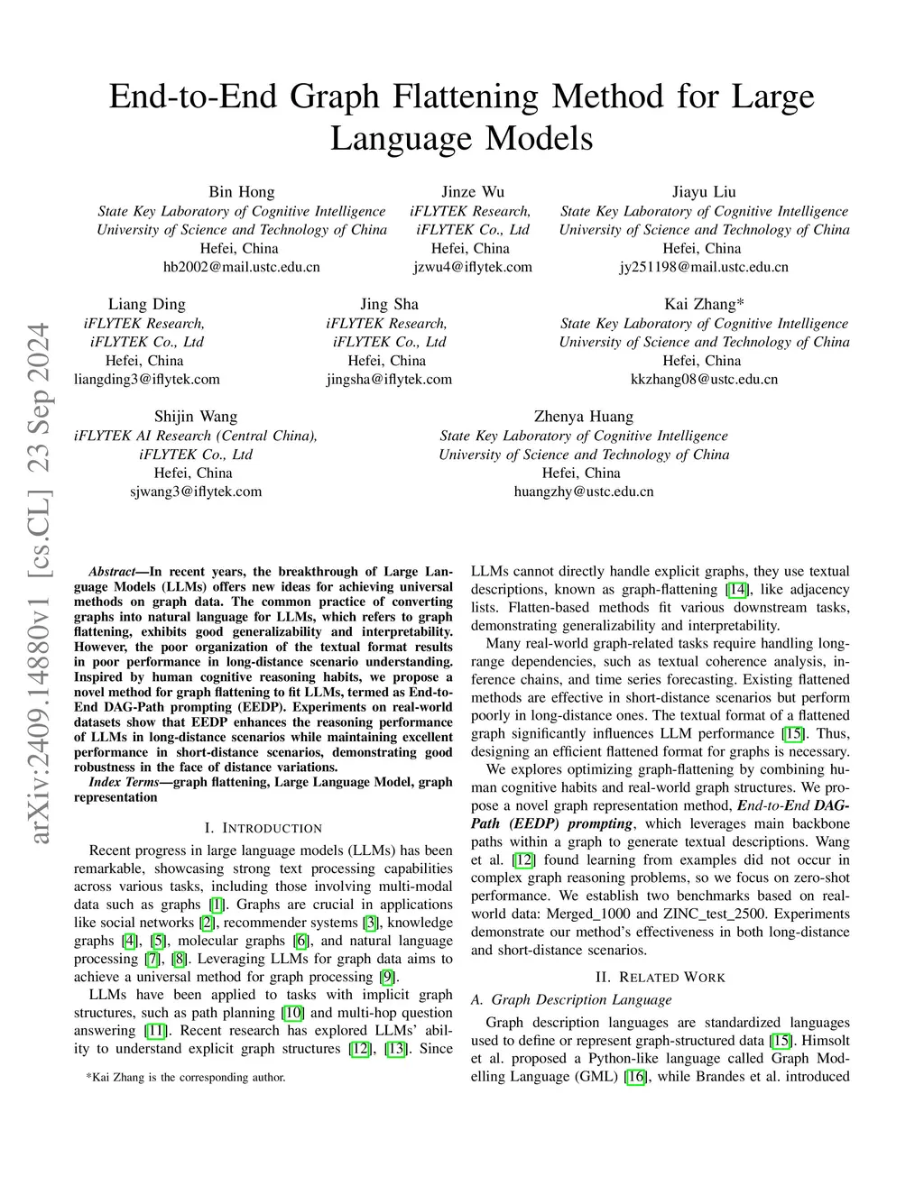 In recent years, the breakthrough of Large Language Models (LLMs) offers new ideas for achieving universal methods on graph data. The common practice of converting graphs into natural language for LLMs, which refers to graph flattening, exhibits good generalizability and interpretability. However, the poor organization of the textual format results in poor performance in long-distance scenario understanding. Inspired by human cognitive reasoning habits, we propose a novel method for graph flattening to fit LLMs, termed as End-to-End DAG-Path prompting (EEDP). Experiments on real-world datasets show that EEDP enhances the reasoning performance of LLMs in long-distance scenarios while maintaining excellent performance in short-distance scenarios, demonstrating good robustness in the face of distance variations.