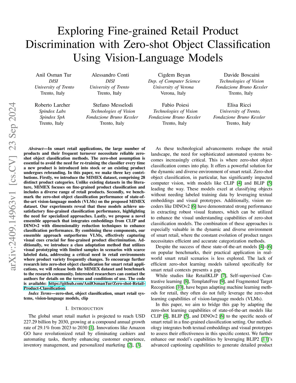 In smart retail applications, the large number of products and their frequent turnover necessitate reliable zero-shot object classification methods. The zero-shot assumption is essential to avoid the need for re-training the classifier every time a new product is introduced into stock or an existing product undergoes rebranding. In this paper, we make three key contributions. Firstly, we introduce the MIMEX dataset, comprising 28 distinct product categories. Unlike existing datasets in the literature, MIMEX focuses on fine-grained product classification and includes a diverse range of retail products. Secondly, we benchmark the zero-shot object classification performance of state-of-the-art vision-language models (VLMs) on the proposed MIMEX dataset. Our experiments reveal that these models achieve unsatisfactory fine-grained classification performance, highlighting the need for specialized approaches. Lastly, we propose a novel ensemble approach that integrates embeddings from CLIP and DINOv2 with dimensionality reduction techniques to enhance classification performance. By combining these components, our ensemble approach outperforms VLMs, effectively capturing visual cues crucial for fine-grained product discrimination. Additionally, we introduce a class adaptation method that utilizes visual prototyping with limited samples in scenarios with scarce labeled data, addressing a critical need in retail environments where product variety frequently changes. To encourage further research into zero-shot object classification for smart retail applications, we will release both the MIMEX dataset and benchmark to the research community. Interested researchers can contact the authors for details on the terms and conditions of use. The code is available: https://github.com/AnilOsmanTur/Zero-shot-Retail-Product-Classification.