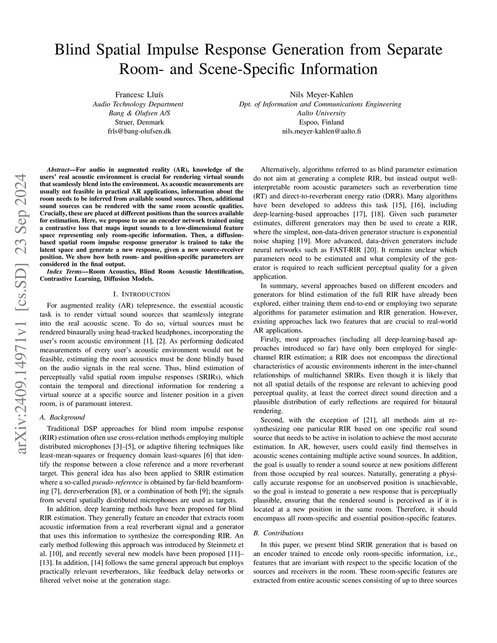 For audio in augmented reality (AR), knowledge of the users' real acoustic environment is crucial for rendering virtual sounds that seamlessly blend into the environment. As acoustic measurements are usually not feasible in practical AR applications, information about the room needs to be inferred from available sound sources. Then, additional sound sources can be rendered with the same room acoustic qualities. Crucially, these are placed at different positions than the sources available for estimation. Here, we propose to use an encoder network trained using a contrastive loss that maps input sounds to a low-dimensional feature space representing only room-specific information. Then, a diffusion-based spatial room impulse response generator is trained to take the latent space and generate a new response, given a new source-receiver position. We show how both room- and position-specific parameters are considered in the final output.