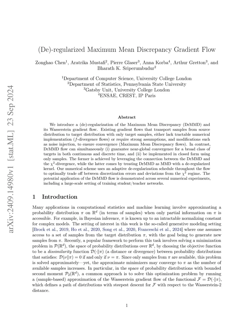 We introduce a (de)-regularization of the Maximum Mean Discrepancy (DrMMD) and its Wasserstein gradient flow. Existing gradient flows that transport samples from source distribution to target distribution with only target samples, either lack tractable numerical implementation (-divergence flows) or require strong assumptions, and modifications such as noise injection, to ensure convergence (Maximum Mean Discrepancy flows). In contrast, DrMMD flow can simultaneously (i) guarantee near-global convergence for a broad class of targets in both continuous and discrete time, and (ii) be implemented in closed form using only samples. The former is achieved by leveraging the connection between the DrMMD and the -divergence, while the latter comes by treating DrMMD as MMD with a de-regularized kernel. Our numerical scheme uses an adaptive de-regularization schedule throughout the flow to optimally trade off between discretization errors and deviations from the regime. The potential application of the DrMMD flow is demonstrated across several numerical experiments, including a large-scale setting of training student/teacher networks.