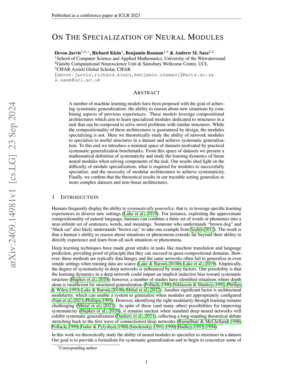 A number of machine learning models have been proposed with the goal of achieving systematic generalization: the ability to reason about new situations by combining aspects of previous experiences. These models leverage compositional architectures which aim to learn specialized modules dedicated to structures in a task that can be composed to solve novel problems with similar structures. While the compositionality of these architectures is guaranteed by design, the modules specializing is not. Here we theoretically study the ability of network modules to specialize to useful structures in a dataset and achieve systematic generalization. To this end we introduce a minimal space of datasets motivated by practical systematic generalization benchmarks. From this space of datasets we present a mathematical definition of systematicity and study the learning dynamics of linear neural modules when solving components of the task. Our results shed light on the difficulty of module specialization, what is required for modules to successfully specialize, and the necessity of modular architectures to achieve systematicity. Finally, we confirm that the theoretical results in our tractable setting generalize to more complex datasets and non-linear architectures.
