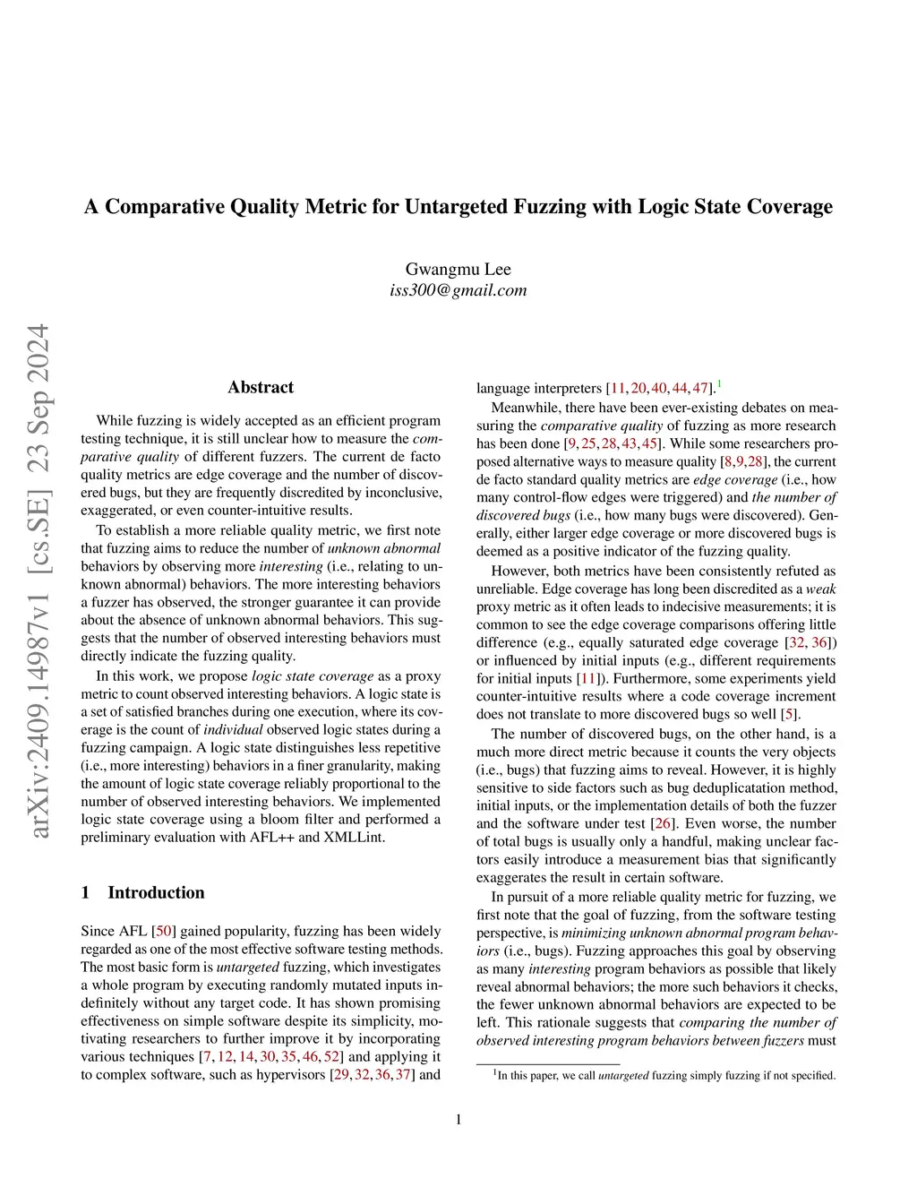 While fuzzing is widely accepted as an efficient program testing technique, it is still unclear how to measure the comparative quality of different fuzzers. The current de facto quality metrics are edge coverage and the number of discovered bugs, but they are frequently discredited by inconclusive, exaggerated, or even counter-intuitive results. To establish a more reliable quality metric, we first note that fuzzing aims to reduce the number of unknown abnormal behaviors by observing more interesting (i.e., relating to unknown abnormal) behaviors. The more interesting behaviors a fuzzer has observed, the stronger guarantee it can provide about the absence of unknown abnormal behaviors. This suggests that the number of observed interesting behaviors must directly indicate the fuzzing quality. In this work, we propose logic state coverage as a proxy metric to count observed interesting behaviors. A logic state is a set of satisfied branches during one execution, where its coverage is the count of individual observed logic states during a fuzzing campaign. A logic state distinguishes less repetitive (i.e., more interesting) behaviors in a finer granularity, making the amount of logic state coverage reliably proportional to the number of observed interesting behaviors. We implemented logic state coverage using a bloom filter and performed a preliminary evaluation with AFL++ and XMLLint.