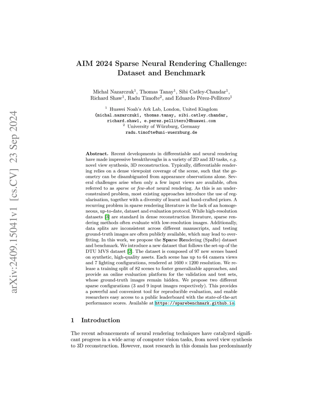 AIM 2024 Sparse Neural Rendering Challenge: Dataset and Benchmark