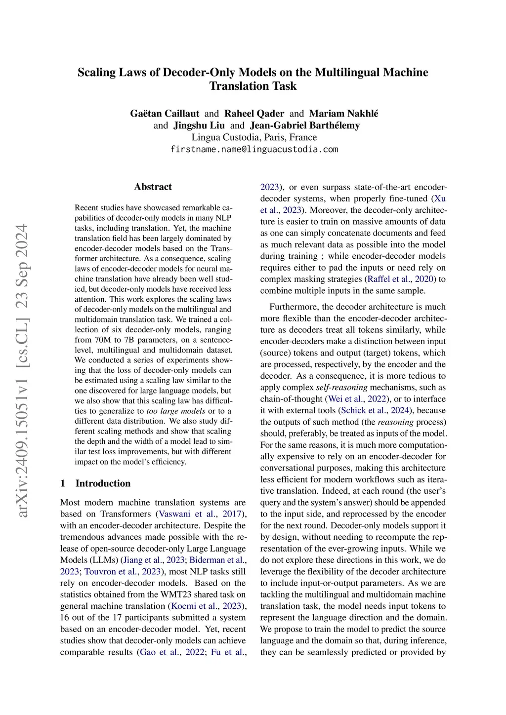 Recent studies have showcased remarkable capabilities of decoder-only models in many NLP tasks, including translation. Yet, the machine translation field has been largely dominated by encoder-decoder models based on the Transformer architecture. As a consequence, scaling laws of encoder-decoder models for neural machine translation have already been well studied, but decoder-only models have received less attention. This work explores the scaling laws of decoder-only models on the multilingual and multidomain translation task. We trained a collection of six decoder-only models, ranging from 70M to 7B parameters, on a sentence-level, multilingual and multidomain dataset. We conducted a series of experiments showing that the loss of decoder-only models can be estimated using a scaling law similar to the one discovered for large language models, but we also show that this scaling law has difficulties to generalize to too large models or to a different data distribution. We also study different scaling methods and show that scaling the depth and the width of a model lead to similar test loss improvements, but with different impact on the model's efficiency.