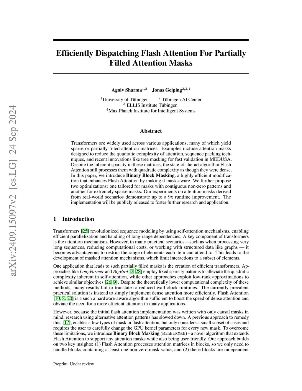Transformers are widely used across various applications, many of which yield sparse or partially filled attention matrices. Examples include attention masks designed to reduce the quadratic complexity of attention, sequence packing techniques, and recent innovations like tree masking for fast validation in MEDUSA. Despite the inherent sparsity in these matrices, the state-of-the-art algorithm Flash Attention still processes them with quadratic complexity as though they were dense. In this paper, we introduce Binary Block Masking, a highly efficient modification that enhances Flash Attention by making it mask-aware. We further propose two optimizations: one tailored for masks with contiguous non-zero patterns and another for extremely sparse masks. Our experiments on attention masks derived from real-world scenarios demonstrate up to a 9x runtime improvement. The implementation will be publicly released to foster further research and application.