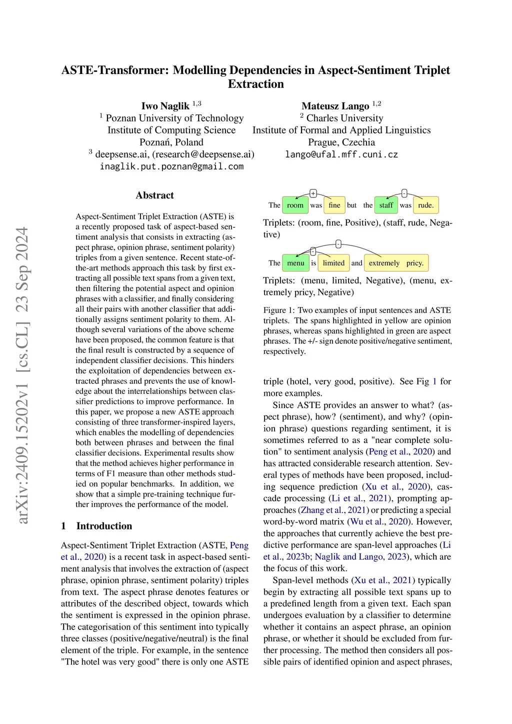 Aspect-Sentiment Triplet Extraction (ASTE) is a recently proposed task of aspect-based sentiment analysis that consists in extracting (aspect phrase, opinion phrase, sentiment polarity) triples from a given sentence. Recent state-of-the-art methods approach this task by first extracting all possible text spans from a given text, then filtering the potential aspect and opinion phrases with a classifier, and finally considering all their pairs with another classifier that additionally assigns sentiment polarity to them. Although several variations of the above scheme have been proposed, the common feature is that the final result is constructed by a sequence of independent classifier decisions. This hinders the exploitation of dependencies between extracted phrases and prevents the use of knowledge about the interrelationships between classifier predictions to improve performance. In this paper, we propose a new ASTE approach consisting of three transformer-inspired layers, which enables the modelling of dependencies both between phrases and between the final classifier decisions. Experimental results show that the method achieves higher performance in terms of F1 measure than other methods studied on popular benchmarks. In addition, we show that a simple pre-training technique further improves the performance of the model.