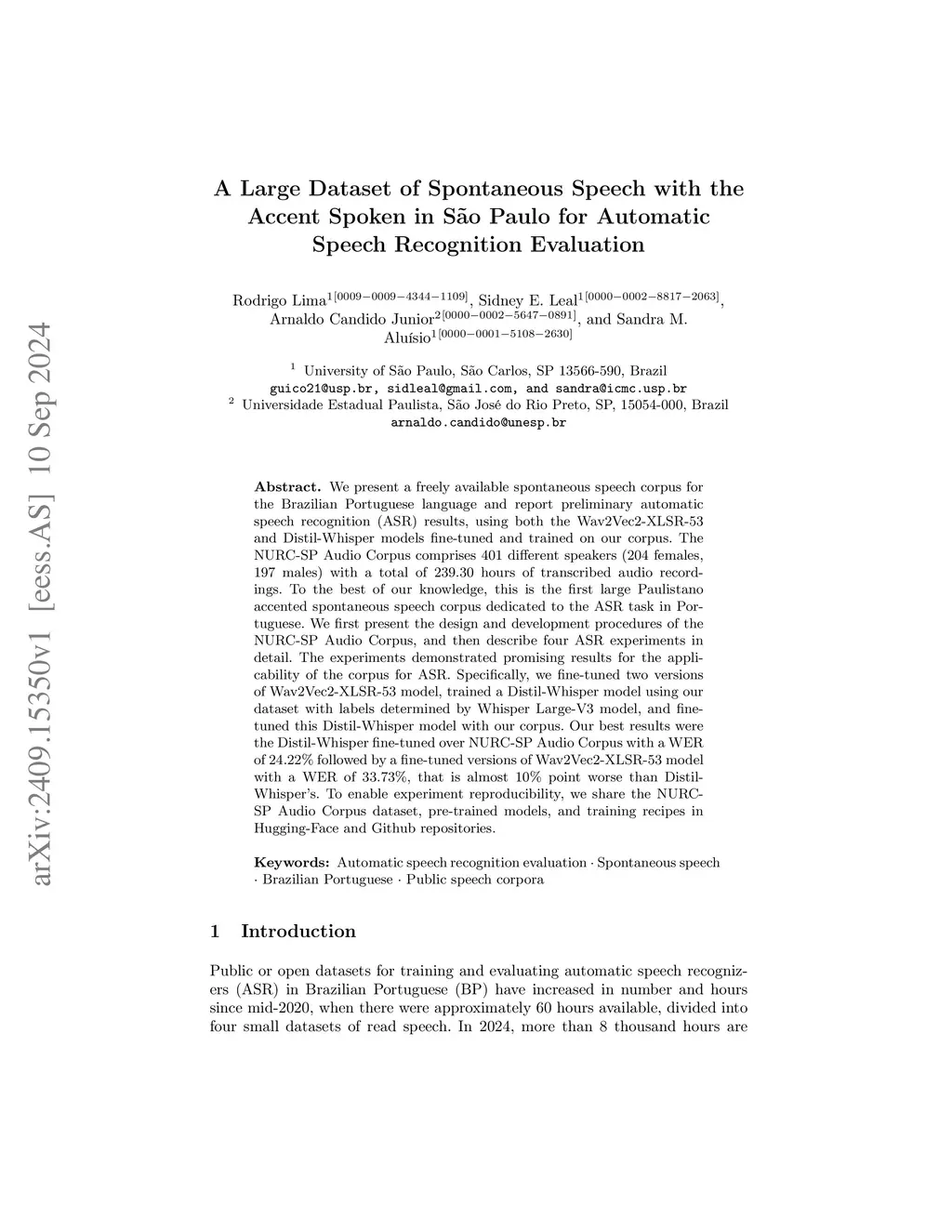 We present a freely available spontaneous speech corpus for the Brazilian Portuguese language and report preliminary automatic speech recognition (ASR) results, using both the Wav2Vec2-XLSR-53 and Distil-Whisper models fine-tuned and trained on our corpus. The NURC-SP Audio Corpus comprises 401 different speakers (204 females, 197 males) with a total of 239.30 hours of transcribed audio recordings. To the best of our knowledge, this is the first large Paulistano accented spontaneous speech corpus dedicated to the ASR task in Portuguese. We first present the design and development procedures of the NURC-SP Audio Corpus, and then describe four ASR experiments in detail. The experiments demonstrated promising results for the applicability of the corpus for ASR. Specifically, we fine-tuned two versions of Wav2Vec2-XLSR-53 model, trained a Distil-Whisper model using our dataset with labels determined by Whisper Large-V3 model, and fine-tuned this Distil-Whisper model with our corpus. Our best results were the Distil-Whisper fine-tuned over NURC-SP Audio Corpus with a WER of 24.22% followed by a fine-tuned versions of Wav2Vec2-XLSR-53 model with a WER of 33.73%, that is almost 10% point worse than Distil-Whisper's. To enable experiment reproducibility, we share the NURC-SP Audio Corpus dataset, pre-trained models, and training recipes in Hugging-Face and Github repositories.