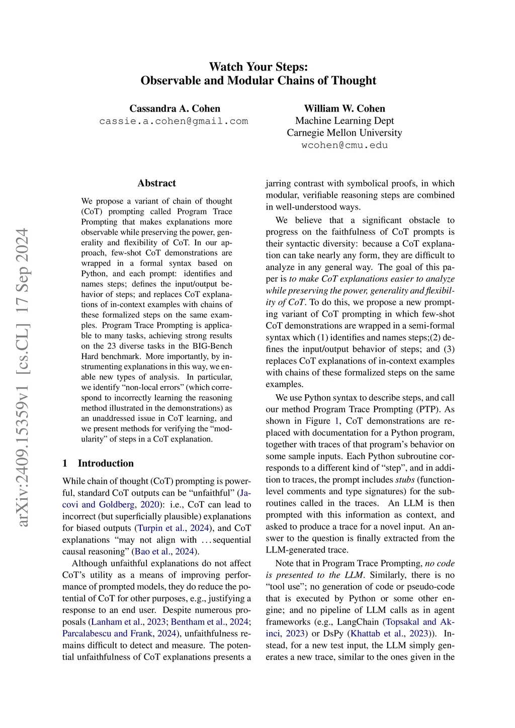 We propose a variant of chain of thought (CoT) prompting called Program Trace Prompting that makes explanations more observable while preserving the power, generality and flexibility of CoT. In our approach, few-shot CoT demonstrations are wrapped in a formal syntax based on Python, and each prompt: identifies and names steps; defines the input/output behavior of steps; and replaces CoT explanations of in-context examples with chains of these formalized steps on the same examples. Program Trace Prompting is applicable to many tasks, achieving strong results on the 23 diverse tasks in the BIG-Bench Hard benchmark. More importantly, by instrumenting explanations in this way, we enable new types of analysis. In particular, we identify "non-local errors" (which correspond to incorrectly learning the reasoning method illustrated in the demonstrations) as an unaddressed issue in CoT learning, and we present methods for verifying the modularity of steps in a CoT explanation.