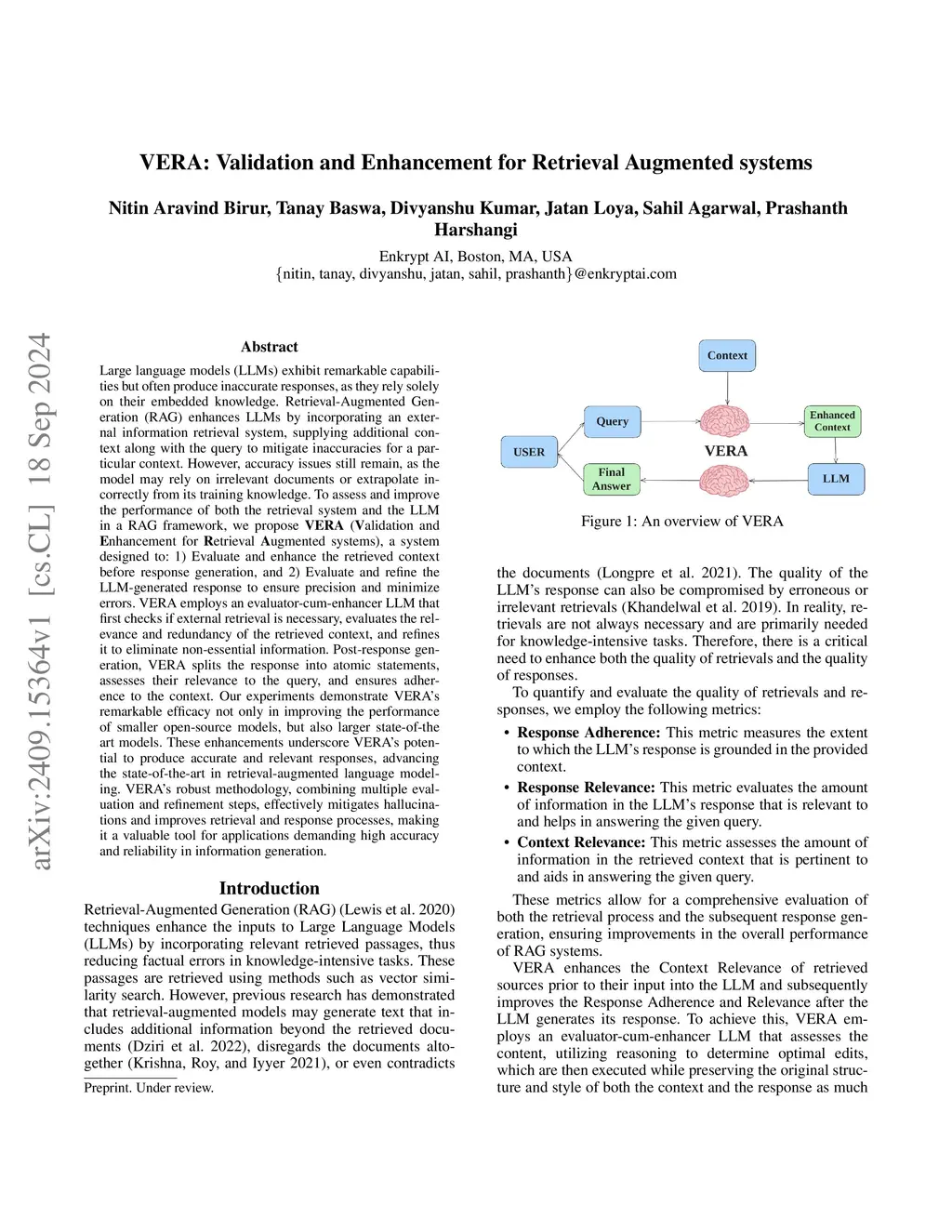 Large language models (LLMs) exhibit remarkable capabilities but often produce inaccurate responses, as they rely solely on their embedded knowledge. Retrieval-Augmented Generation (RAG) enhances LLMs by incorporating an external information retrieval system, supplying additional context along with the query to mitigate inaccuracies for a particular context. However, accuracy issues still remain, as the model may rely on irrelevant documents or extrapolate incorrectly from its training knowledge. To assess and improve the performance of both the retrieval system and the LLM in a RAG framework, we propose \textbf{VERA} (\textbf{V}alidation and \textbf{E}nhancement for \textbf{R}etrieval \textbf{A}ugmented systems), a system designed to: 1) Evaluate and enhance the retrieved context before response generation, and 2) Evaluate and refine the LLM-generated response to ensure precision and minimize errors. VERA employs an evaluator-cum-enhancer LLM that first checks if external retrieval is necessary, evaluates the relevance and redundancy of the retrieved context, and refines it to eliminate non-essential information. Post-response generation, VERA splits the response into atomic statements, assesses their relevance to the query, and ensures adherence to the context. Our experiments demonstrate VERA's remarkable efficacy not only in improving the performance of smaller open-source models, but also larger state-of-the art models. These enhancements underscore VERA's potential to produce accurate and relevant responses, advancing the state-of-the-art in retrieval-augmented language modeling. VERA's robust methodology, combining multiple evaluation and refinement steps, effectively mitigates hallucinations and improves retrieval and response processes, making it a valuable tool for applications demanding high accuracy and reliability in information generation. .