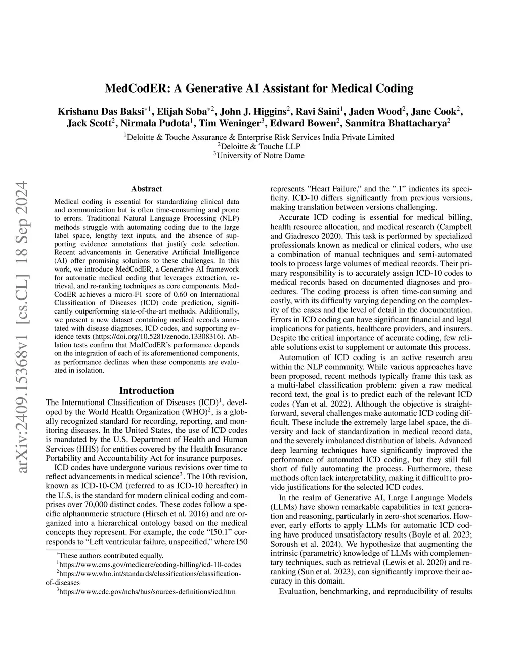 Medical coding is essential for standardizing clinical data and communication but is often time-consuming and prone to errors. Traditional Natural Language Processing (NLP) methods struggle with automating coding due to the large label space, lengthy text inputs, and the absence of supporting evidence annotations that justify code selection. Recent advancements in Generative Artificial Intelligence (AI) offer promising solutions to these challenges. In this work, we introduce MedCodER, a Generative AI framework for automatic medical coding that leverages extraction, retrieval, and re-ranking techniques as core components. MedCodER achieves a micro-F1 score of 0.60 on International Classification of Diseases (ICD) code prediction, significantly outperforming state-of-the-art methods. Additionally, we present a new dataset containing medical records annotated with disease diagnoses, ICD codes, and supporting evidence texts (https://doi.org/10.5281/zenodo.13308316). Ablation tests confirm that MedCodER's performance depends on the integration of each of its aforementioned components, as performance declines when these components are evaluated in isolation.