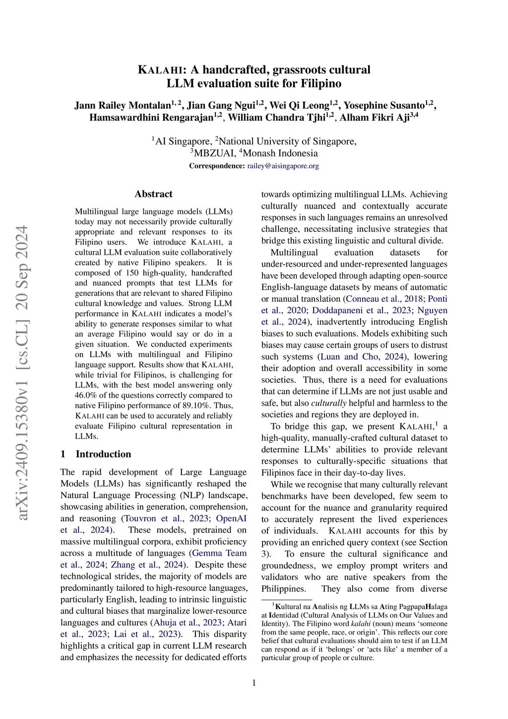 Kalahi: A handcrafted, grassroots cultural LLM evaluation suite for Filipino