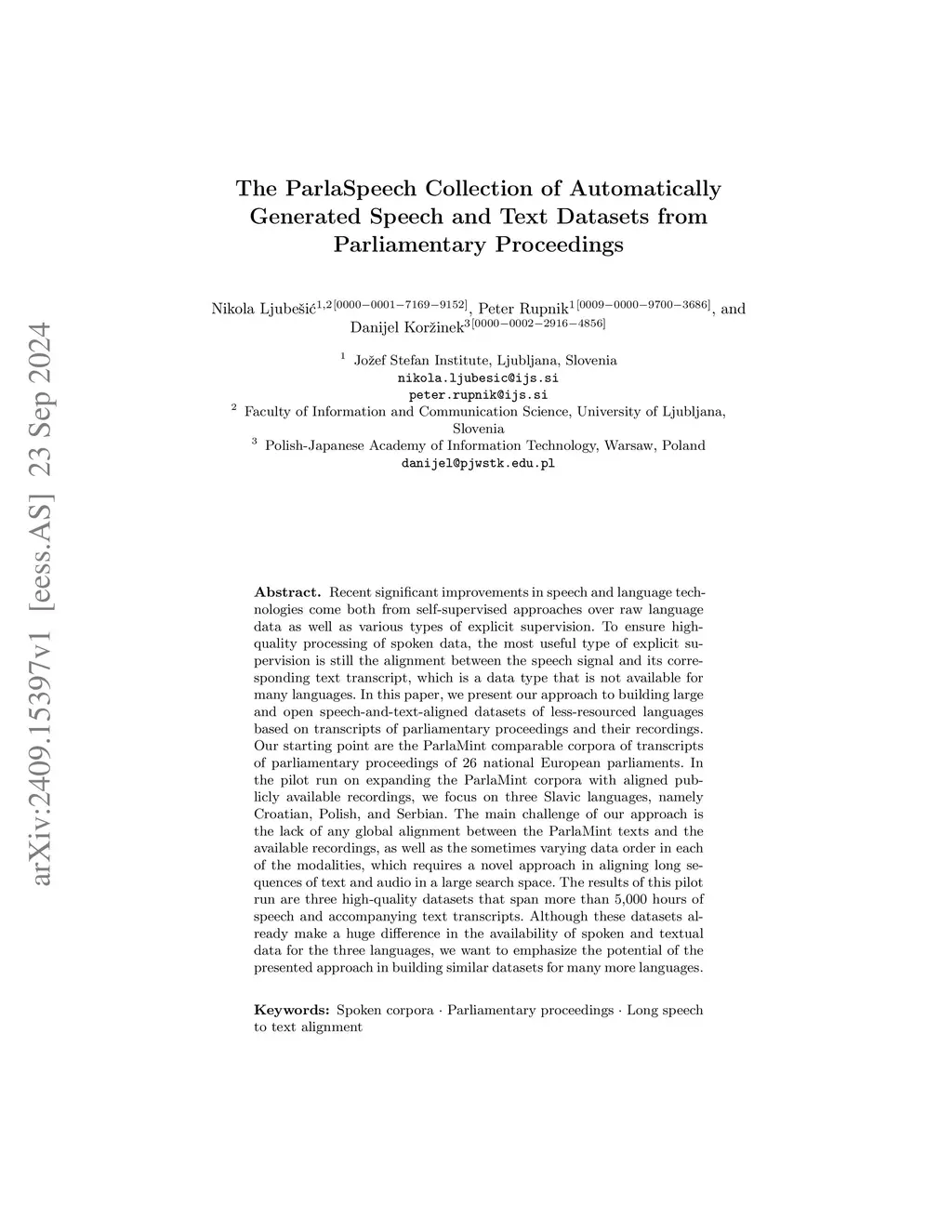 Recent significant improvements in speech and language technologies come both from self-supervised approaches over raw language data as well as various types of explicit supervision. To ensure high-quality processing of spoken data, the most useful type of explicit supervision is still the alignment between the speech signal and its corresponding text transcript, which is a data type that is not available for many languages. In this paper, we present our approach to building large and open speech-and-text-aligned datasets of less-resourced languages based on transcripts of parliamentary proceedings and their recordings. Our starting point are the ParlaMint comparable corpora of transcripts of parliamentary proceedings of 26 national European parliaments. In the pilot run on expanding the ParlaMint corpora with aligned publicly available recordings, we focus on three Slavic languages, namely Croatian, Polish, and Serbian. The main challenge of our approach is the lack of any global alignment between the ParlaMint texts and the available recordings, as well as the sometimes varying data order in each of the modalities, which requires a novel approach in aligning long sequences of text and audio in a large search space. The results of this pilot run are three high-quality datasets that span more than 5,000 hours of speech and accompanying text transcripts. Although these datasets already make a huge difference in the availability of spoken and textual data for the three languages, we want to emphasize the potential of the presented approach in building similar datasets for many more languages.