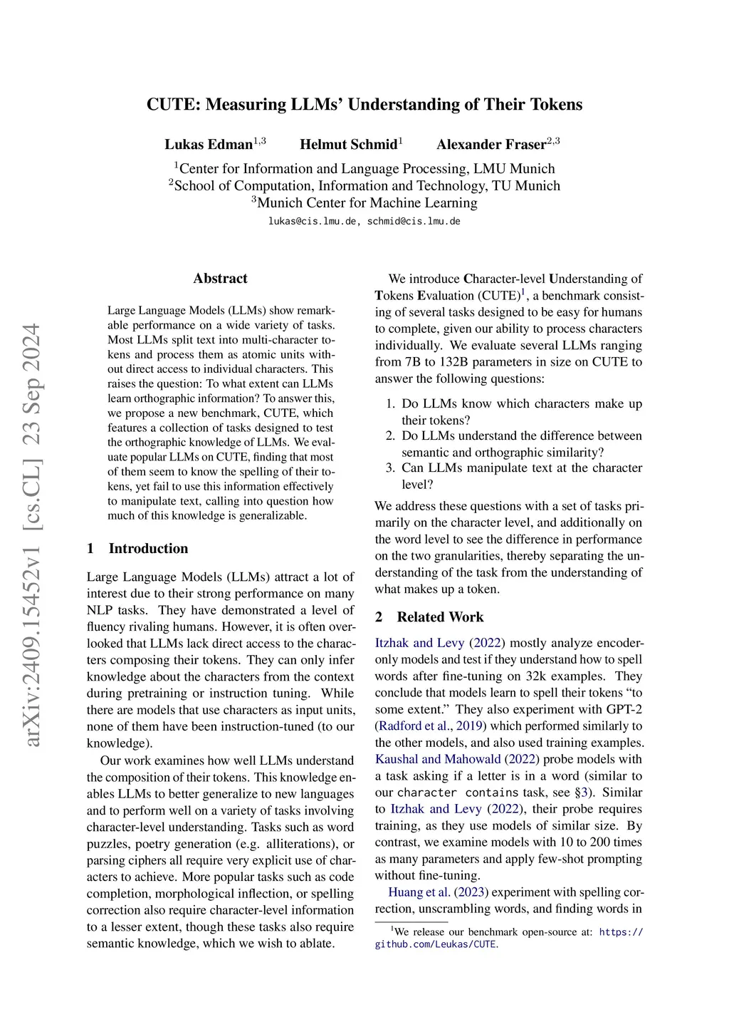 Large Language Models (LLMs) show remarkable performance on a wide variety of tasks. Most LLMs split text into multi-character tokens and process them as atomic units without direct access to individual characters. This raises the question: To what extent can LLMs learn orthographic information? To answer this, we propose a new benchmark, CUTE, which features a collection of tasks designed to test the orthographic knowledge of LLMs. We evaluate popular LLMs on CUTE, finding that most of them seem to know the spelling of their tokens, yet fail to use this information effectively to manipulate text, calling into question how much of this knowledge is generalizable.