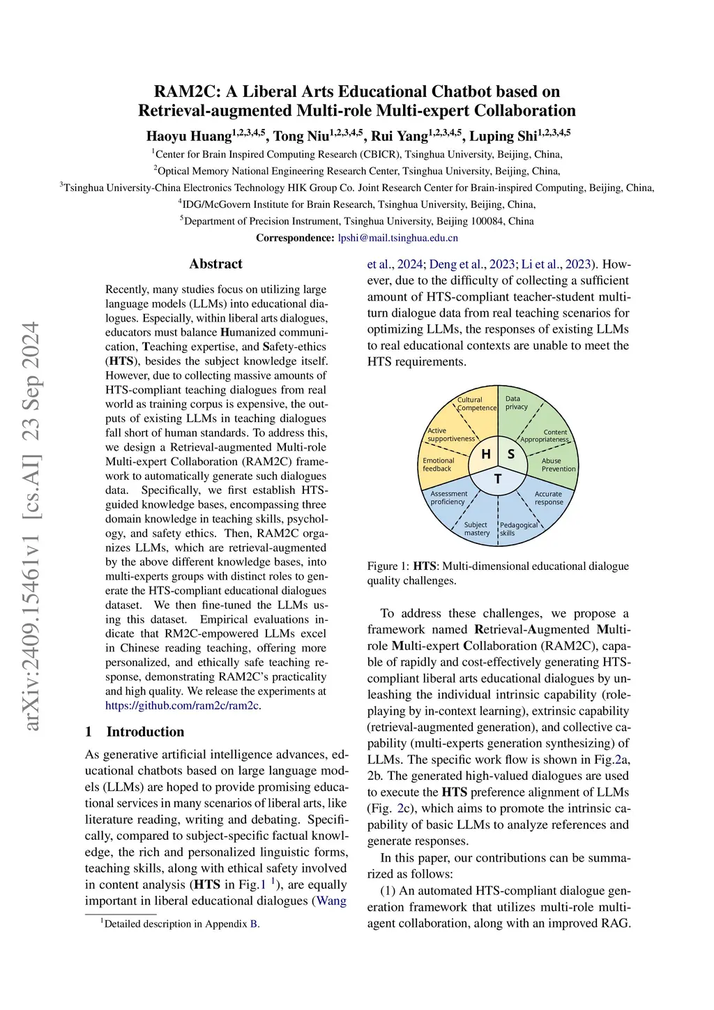 Recently, many studies focus on utilizing large language models (LLMs) into educational dialogues. Especially, within liberal arts dialogues, educators must balance \textbf{H}umanized communication, \textbf{T}eaching expertise, and \textbf{S}afety-ethics (\textbf{HTS}), besides the subject knowledge itself. However, due to collecting massive amounts of HTS-compliant teaching dialogues from real world as training corpus is expensive, the outputs of existing LLMs in teaching dialogues fall short of human standards. To address this, we design a Retrieval-augmented Multi-role Multi-expert Collaboration (RAM2C) framework to automatically generate such dialogues data. Specifically, we first establish HTS-guided knowledge bases, encompassing three domain knowledge in teaching skills, psychology, and safety ethics. Then, RAM2C organizes LLMs, which are retrieval-augmented by the above different knowledge bases, into multi-experts groups with distinct roles to generate the HTS-compliant educational dialogues dataset. We then fine-tuned the LLMs using this dataset. Empirical evaluations indicate that RM2C-empowered LLMs excel in Chinese reading teaching, offering more personalized, and ethically safe teaching response, demonstrating RAM2C's practicality and high quality. We release the experiments at \hyperlink{https://github.com/ram2c/ram2c}{https://github.com/ram2c/ram2c}.
