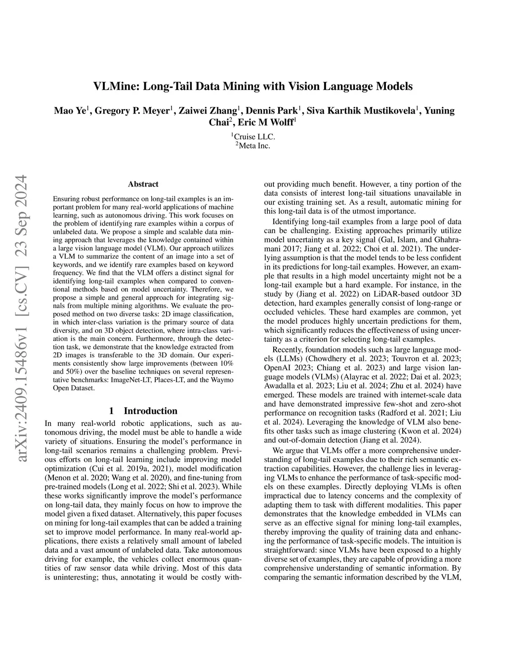 Ensuring robust performance on long-tail examples is an important problem for many real-world applications of machine learning, such as autonomous driving. This work focuses on the problem of identifying rare examples within a corpus of unlabeled data. We propose a simple and scalable data mining approach that leverages the knowledge contained within a large vision language model (VLM). Our approach utilizes a VLM to summarize the content of an image into a set of keywords, and we identify rare examples based on keyword frequency. We find that the VLM offers a distinct signal for identifying long-tail examples when compared to conventional methods based on model uncertainty. Therefore, we propose a simple and general approach for integrating signals from multiple mining algorithms. We evaluate the proposed method on two diverse tasks: 2D image classification, in which inter-class variation is the primary source of data diversity, and on 3D object detection, where intra-class variation is the main concern. Furthermore, through the detection task, we demonstrate that the knowledge extracted from 2D images is transferable to the 3D domain. Our experiments consistently show large improvements (between 10\% and 50\%) over the baseline techniques on several representative benchmarks: ImageNet-LT, Places-LT, and the Waymo Open Dataset.