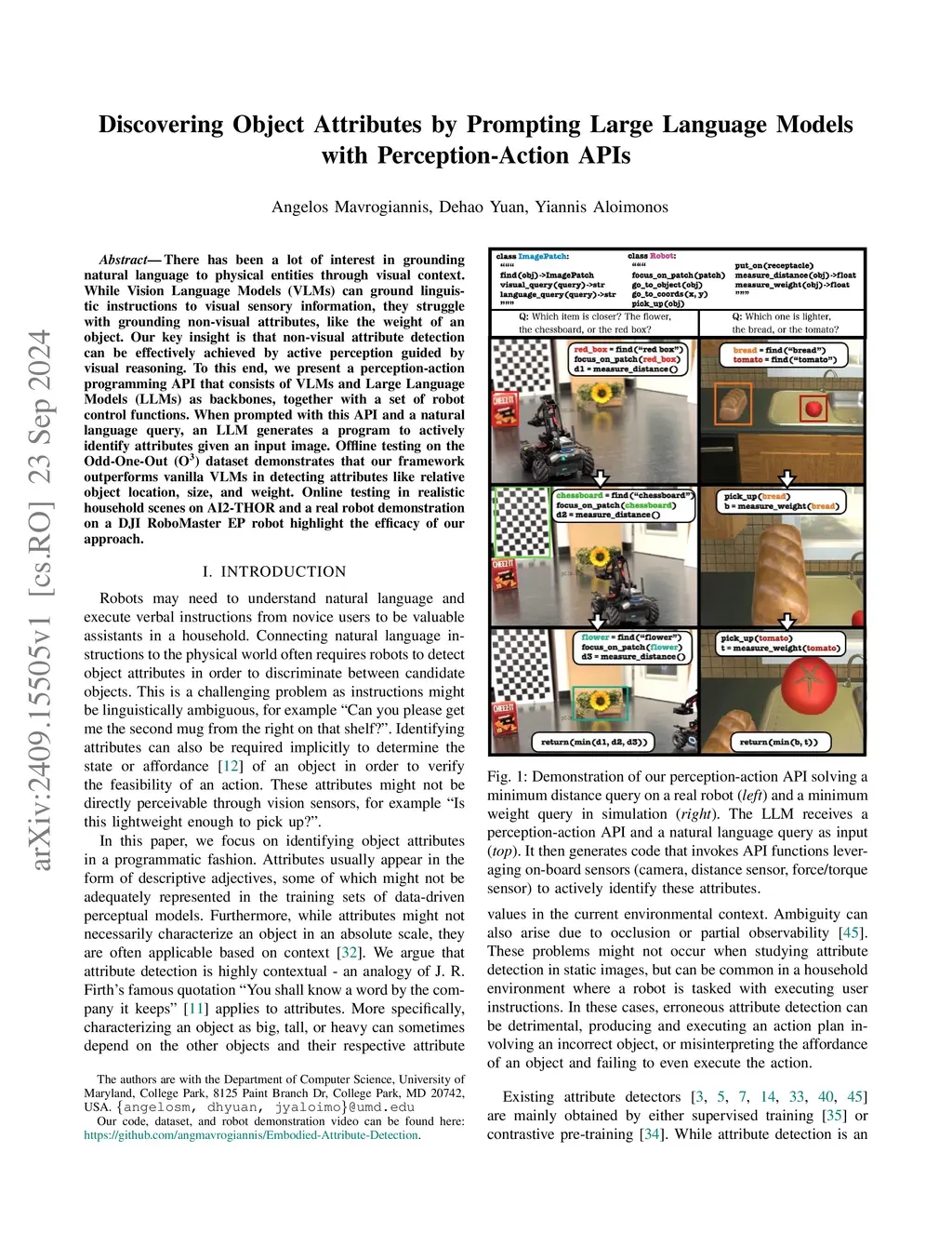 There has been a lot of interest in grounding natural language to physical entities through visual context. While Vision Language Models (VLMs) can ground linguistic instructions to visual sensory information, they struggle with grounding non-visual attributes, like the weight of an object. Our key insight is that non-visual attribute detection can be effectively achieved by active perception guided by visual reasoning. To this end, we present a perception-action API that consists of VLMs and Large Language Models (LLMs) as backbones, together with a set of robot control functions. When prompted with this API and a natural language query, an LLM generates a program to actively identify attributes given an input image. Offline testing on the Odd-One-Out dataset demonstrates that our framework outperforms vanilla VLMs in detecting attributes like relative object location, size, and weight. Online testing in realistic household scenes on AI2-THOR and a real robot demonstration on a DJI RoboMaster EP robot highlight the efficacy of our approach.