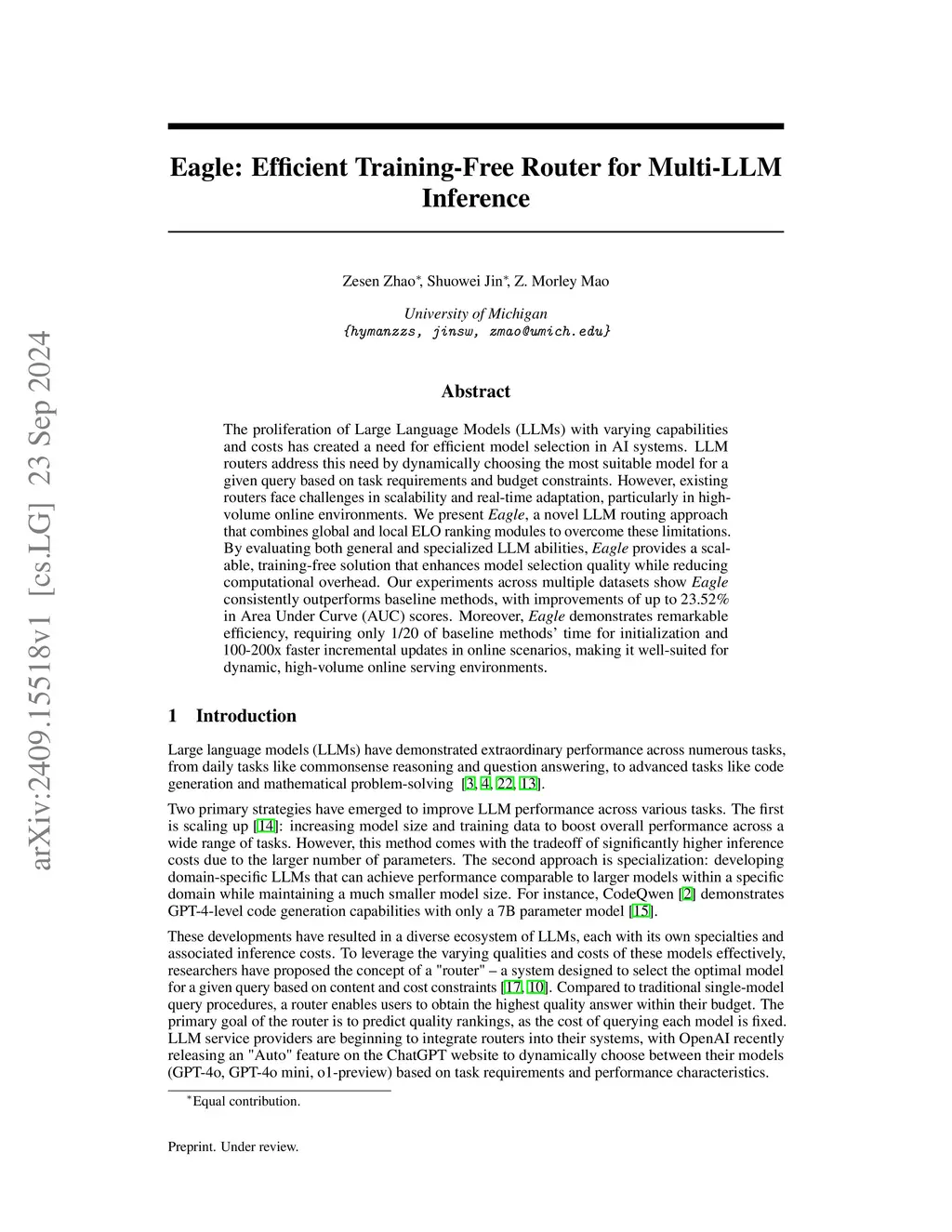 The proliferation of Large Language Models (LLMs) with varying capabilities and costs has created a need for efficient model selection in AI systems. LLM routers address this need by dynamically choosing the most suitable model for a given query based on task requirements and budget constraints. However, existing routers face challenges in scalability and real-time adaptation, particularly in high-volume online environments. We present Eagle, a novel LLM routing approach that combines global and local ELO ranking modules to overcome these limitations. By evaluating both general and specialized LLM abilities, Eagle provides a scalable, training-free solution that enhances model selection quality while reducing computational overhead. Our experiments across multiple datasets show Eagle consistently outperforms baseline methods, with improvements of up to 23.52 percent in Area Under Curve (AUC) scores. Moreover, Eagle demonstrates remarkable efficiency, requiring only 1/20 of baseline methods' time for initialization and 100 to 200 times faster incremental updates in online scenarios, making it well-suited for dynamic, high-volume online serving environments.