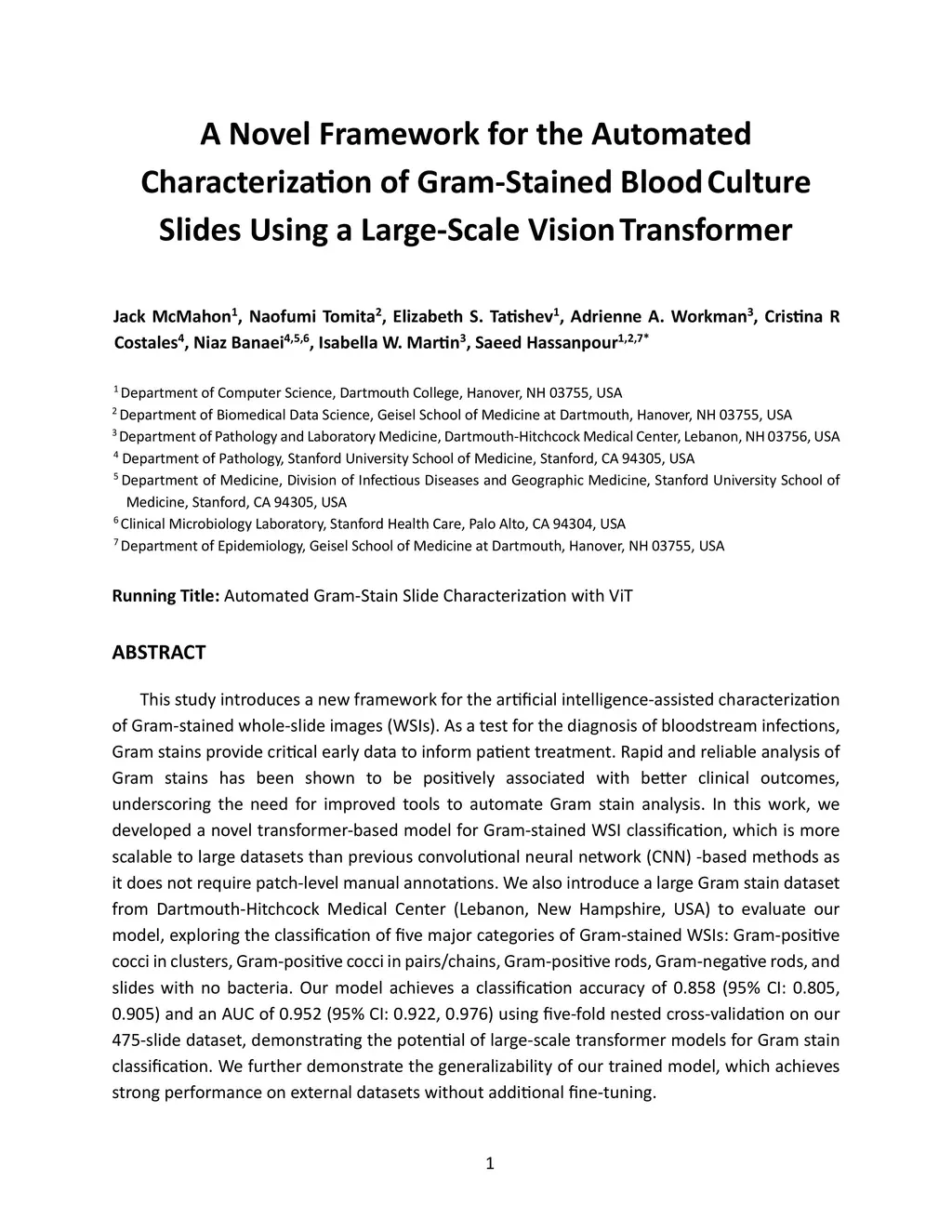 This study introduces a new framework for the artificial intelligence-assisted characterization of Gram-stained whole-slide images (WSIs). As a test for the diagnosis of bloodstream infections, Gram stains provide critical early data to inform patient treatment. Rapid and reliable analysis of Gram stains has been shown to be positively associated with better clinical outcomes, underscoring the need for improved tools to automate Gram stain analysis. In this work, we developed a novel transformer-based model for Gram-stained WSI classification, which is more scalable to large datasets than previous convolutional neural network (CNN) -based methods as it does not require patch-level manual annotations. We also introduce a large Gram stain dataset from Dartmouth-Hitchcock Medical Center (Lebanon, New Hampshire, USA) to evaluate our model, exploring the classification of five major categories of Gram-stained WSIs: Gram-positive cocci in clusters, Gram-positive cocci in pairs/chains, Gram-positive rods, Gram-negative rods, and slides with no bacteria. Our model achieves a classification accuracy of 0.858 (95% CI: 0.805, 0.905) and an AUC of 0.952 (95% CI: 0.922, 0.976) using five-fold nested cross-validation on our 475-slide dataset, demonstrating the potential of large-scale transformer models for Gram stain classification. We further demonstrate the generalizability of our trained model, which achieves strong performance on external datasets without additional fine-tuning.