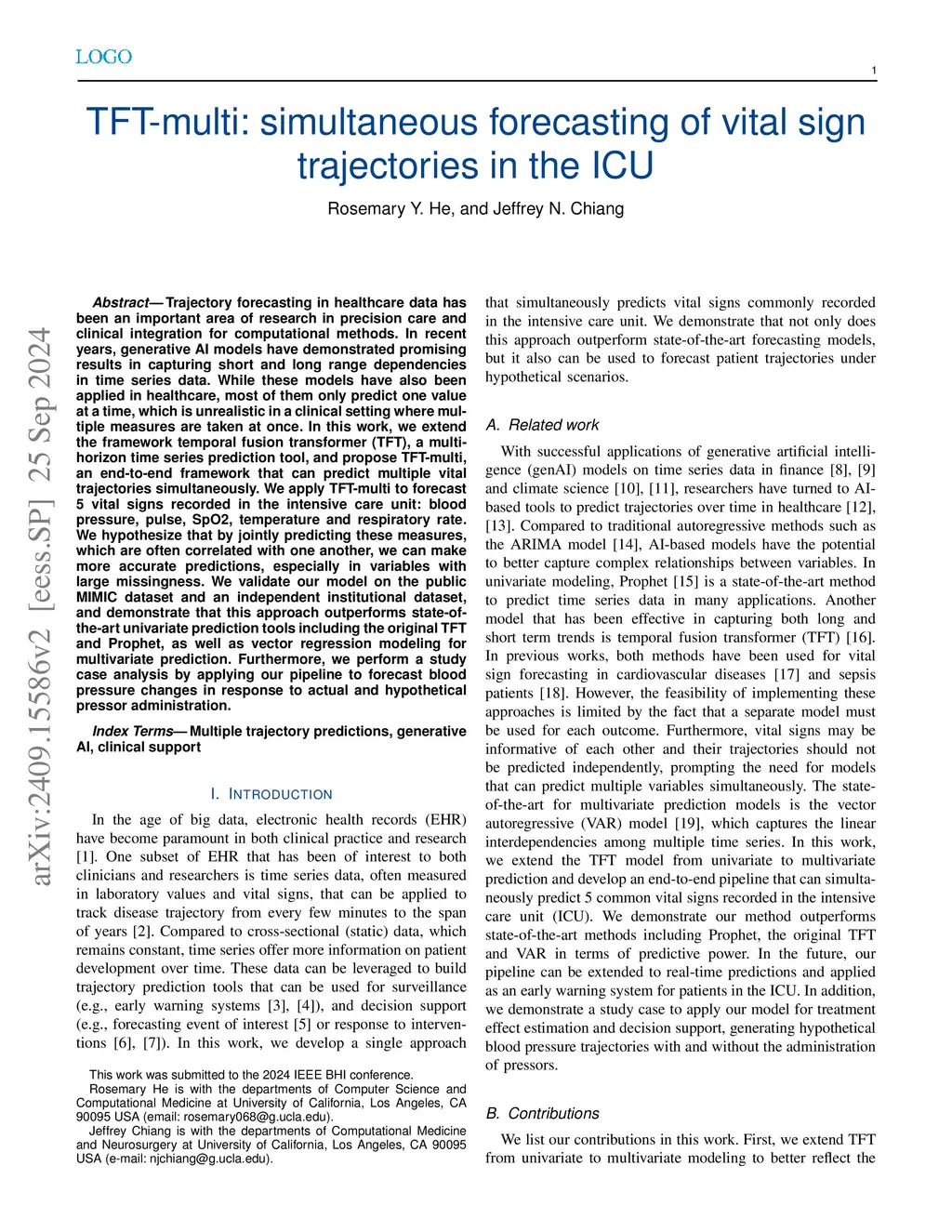 Trajectory forecasting in healthcare data has been an important area of research in precision care and clinical integration for computational methods. In recent years, generative AI models have demonstrated promising results in capturing short and long range dependencies in time series data. While these models have also been applied in healthcare, most of them only predict one value at a time, which is unrealistic in a clinical setting where multiple measures are taken at once. In this work, we extend the framework temporal fusion transformer (TFT), a multi-horizon time series prediction tool, and propose TFT-multi, an end-to-end framework that can predict multiple vital trajectories simultaneously. We apply TFT-multi to forecast 5 vital signs recorded in the intensive care unit: blood pressure, pulse, SpO2, temperature and respiratory rate. We hypothesize that by jointly predicting these measures, which are often correlated with one another, we can make more accurate predictions, especially in variables with large missingness. We validate our model on the public MIMIC dataset and an independent institutional dataset, and demonstrate that this approach outperforms state-of-the-art univariate prediction tools including the original TFT and Prophet, as well as vector regression modeling for multivariate prediction. Furthermore, we perform a study case analysis by applying our pipeline to forecast blood pressure changes in response to actual and hypothetical pressor administration.
