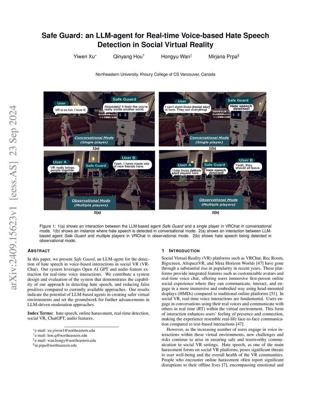 In this paper, we present Safe Guard, an LLM-agent for the detection of hate speech in voice-based interactions in social VR (VRChat). Our system leverages Open AI GPT and audio feature extraction for real-time voice interactions. We contribute a system design and evaluation of the system that demonstrates the capability of our approach in detecting hate speech, and reducing false positives compared to currently available approaches. Our results indicate the potential of LLM-based agents in creating safer virtual environments and set the groundwork for further advancements in LLM-driven moderation approaches.