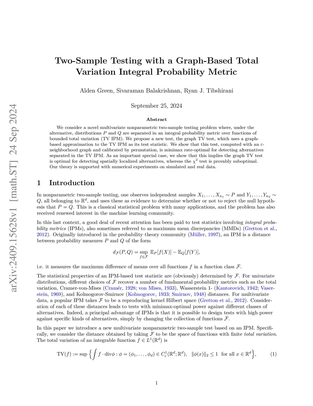 We consider a novel multivariate nonparametric two-sample testing problem where, under the alternative, distributions and are separated in an integral probability metric over functions of bounded total variation (TV IPM). We propose a new test, the graph TV test, which uses a graph-based approximation to the TV IPM as its test statistic. We show that this test, computed with an -neighborhood graph and calibrated by permutation, is minimax rate-optimal for detecting alternatives separated in the TV IPM. As an important special case, we show that this implies the graph TV test is optimal for detecting spatially localized alternatives, whereas the test is provably suboptimal. Our theory is supported with numerical experiments on simulated and real data.