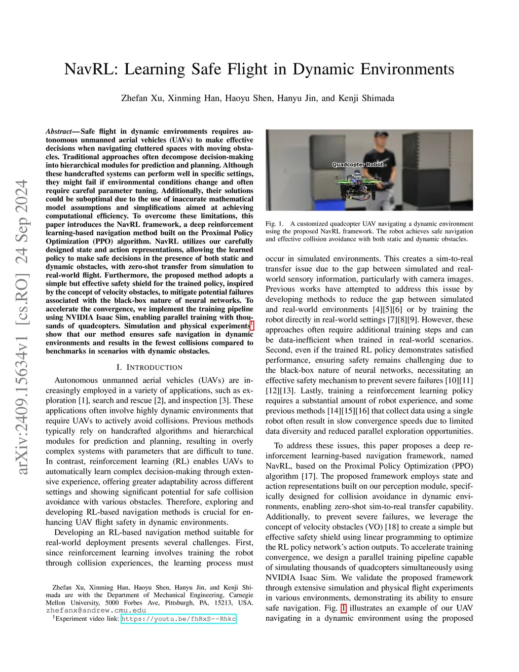 Safe flight in dynamic environments requires unmanned aerial vehicles (UAVs) to make effective decisions when navigating cluttered spaces with moving obstacles. Traditional approaches often decompose decision-making into hierarchical modules for prediction and planning. Although these handcrafted systems can perform well in specific settings, they might fail if environmental conditions change and often require careful parameter tuning. Additionally, their solutions could be suboptimal due to the use of inaccurate mathematical model assumptions and simplifications aimed at achieving computational efficiency. To overcome these limitations, this paper introduces the NavRL framework, a deep reinforcement learning-based navigation method built on the Proximal Policy Optimization (PPO) algorithm. NavRL utilizes our carefully designed state and action representations, allowing the learned policy to make safe decisions in the presence of both static and dynamic obstacles, with zero-shot transfer from simulation to real-world flight. Furthermore, the proposed method adopts a simple but effective safety shield for the trained policy, inspired by the concept of velocity obstacles, to mitigate potential failures associated with the black-box nature of neural networks. To accelerate the convergence, we implement the training pipeline using NVIDIA Isaac Sim, enabling parallel training with thousands of quadcopters. Simulation and physical experiments show that our method ensures safe navigation in dynamic environments and results in the fewest collisions compared to benchmarks.