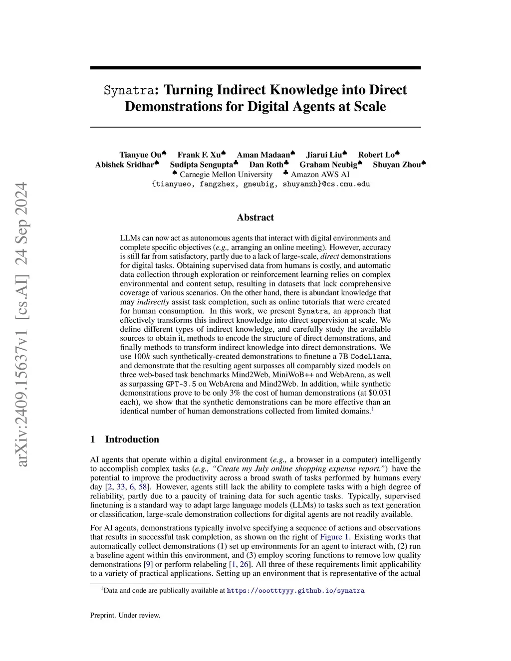 LLMs can now act as autonomous agents that interact with digital environments and complete specific objectives (e.g., arranging an online meeting). However, accuracy is still far from satisfactory, partly due to a lack of large-scale, direct demonstrations for digital tasks. Obtaining supervised data from humans is costly, and automatic data collection through exploration or reinforcement learning relies on complex environmental and content setup, resulting in datasets that lack comprehensive coverage of various scenarios. On the other hand, there is abundant knowledge that may indirectly assist task completion, such as online tutorials that were created for human consumption. In this work, we present Synatra, an approach that effectively transforms this indirect knowledge into direct supervision at scale. We define different types of indirect knowledge, and carefully study the available sources to obtain it, methods to encode the structure of direct demonstrations, and finally methods to transform indirect knowledge into direct demonstrations. We use 100k such synthetically-created demonstrations to finetune a 7B CodeLlama, and demonstrate that the resulting agent surpasses all comparably sized models on three web-based task benchmarks Mind2Web, MiniWoB++ and WebArena, as well as surpassing GPT-3.5 on WebArena and Mind2Web. In addition, while synthetic demonstrations prove to be only 3% the cost of human demonstrations (at $0.031 each), we show that the synthetic demonstrations can be more effective than an identical number of human demonstrations collected from limited domains.