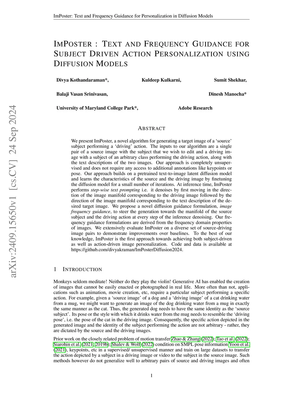 We present ImPoster, a novel algorithm for generating a target image of a 'source' subject performing a 'driving' action. The inputs to our algorithm are a single pair of a source image with the subject that we wish to edit and a driving image with a subject of an arbitrary class performing the driving action, along with the text descriptions of the two images. Our approach is completely unsupervised and does not require any access to additional annotations like keypoints or pose. Our approach builds on a pretrained text-to-image latent diffusion model and learns the characteristics of the source and the driving image by finetuning the diffusion model for a small number of iterations. At inference time, ImPoster performs step-wise text prompting i.e. it denoises by first moving in the direction of the image manifold corresponding to the driving image followed by the direction of the image manifold corresponding to the text description of the desired target image. We propose a novel diffusion guidance formulation, image frequency guidance, to steer the generation towards the manifold of the source subject and the driving action at every step of the inference denoising. Our frequency guidance formulations are derived from the frequency domain properties of images. We extensively evaluate ImPoster on a diverse set of source-driving image pairs to demonstrate improvements over baselines. To the best of our knowledge, ImPoster is the first approach towards achieving both subject-driven as well as action-driven image personalization. Code and data is available at https://github.com/divyakraman/ImPosterDiffusion2024.