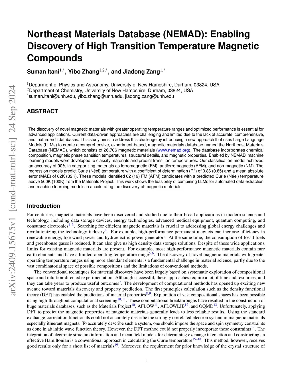 The discovery of magnetic materials with high operating temperature ranges and optimized performance is essential for advanced applications. Current data-driven approaches are limited by the lack of accurate, comprehensive, and feature-rich databases. This study aims to address this challenge by using Large Language Models (LLMs) to create a comprehensive, experiment-based, magnetic materials database named the Northeast Materials Database (NEMAD), which consists of 67,573 magnetic materials entries(this http URL). The database incorporates chemical composition, magnetic phase transition temperatures, structural details, and magnetic properties. Enabled by NEMAD, we trained machine learning models to classify materials and predict transition temperatures. Our classification model achieved an accuracy of 90% in categorizing materials as ferromagnetic (FM), antiferromagnetic (AFM), and non-magnetic (NM). The regression models predict Curie (Néel) temperature with a coefficient of determination (R2) of 0.87 (0.83) and a mean absolute error (MAE) of 56K (38K). These models identified 25 (13) FM (AFM) candidates with a predicted Curie (Néel) temperature above 500K (100K) from the Materials Project. This work shows the feasibility of combining LLMs for automated data extraction and machine learning models to accelerate the discovery of magnetic materials.