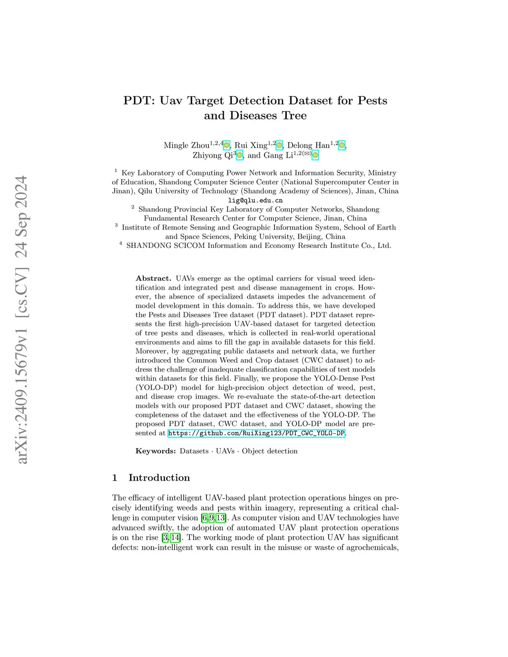 UAVs emerge as the optimal carriers for visual weed iden?tification and integrated pest and disease management in crops. How?ever, the absence of specialized datasets impedes the advancement of model development in this domain. To address this, we have developed the Pests and Diseases Tree dataset (PDT dataset). PDT dataset repre?sents the first high-precision UAV-based dataset for targeted detection of tree pests and diseases, which is collected in real-world operational environments and aims to fill the gap in available datasets for this field. Moreover, by aggregating public datasets and network data, we further introduced the Common Weed and Crop dataset (CWC dataset) to ad?dress the challenge of inadequate classification capabilities of test models within datasets for this field. Finally, we propose the YOLO-Dense Pest (YOLO-DP) model for high-precision object detection of weed, pest, and disease crop images. We re-evaluate the state-of-the-art detection models with our proposed PDT dataset and CWC dataset, showing the completeness of the dataset and the effectiveness of the YOLO-DP. The proposed PDT dataset, CWC dataset, and YOLO-DP model are pre?sented at https://github.com/RuiXing123/PDT_CWC_YOLO-DP.